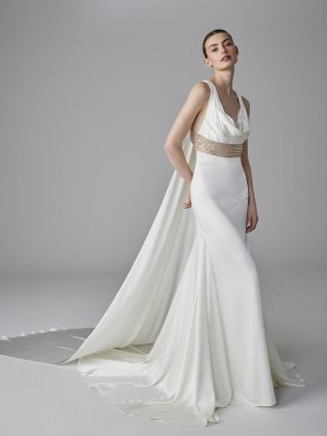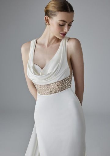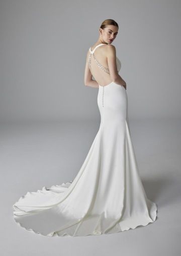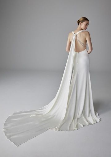 Šaty ZOE zaujmou svými detaily. Tento design, vyrobený výhradně z jemného elastického saténu, má mírně hluboký srdíčkový výstřih s vodou a s korálkovým páskem pod poprsím, který se rozprostírá kolem zad a vytváří krásný geometrický otvor na zádech. Sukně střihu mořské panny obepíná a zvýrazňuje postavu, zatímco důmyslná zadní vlečka je doplněna odnímatelnou šerpou u výstřihu.