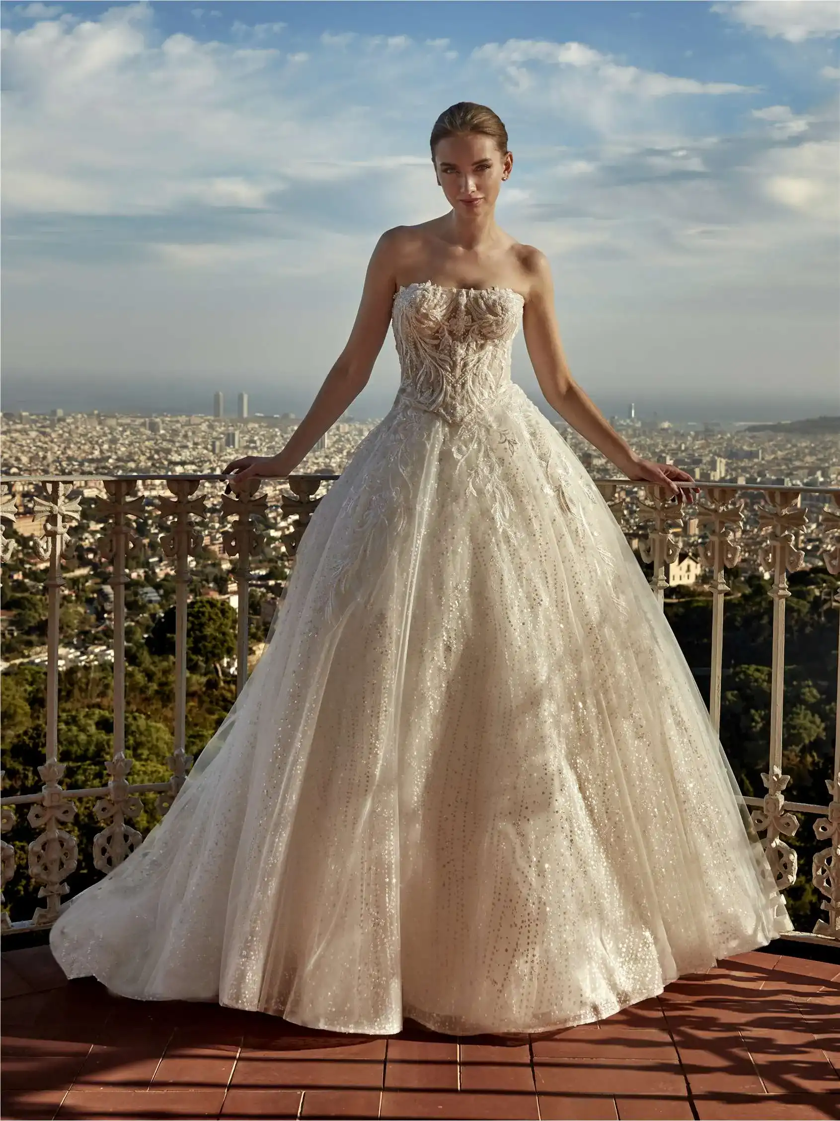 Dvoudílné svatební šaty ALMU jsou luxusní volbou pro nevěstu, která touží po oslnivém efektu. Bohatá princeznovská sukně z vrstveného tylu je zdobena třpytivými flitry a jemnou výšivkou, která se vine po celé délce šatů. Korzet bez ramínek zvýrazňuje ramena a dekolt, zatímco jemně tvarované švy a vyšívané aplikace podtrhují ženské linie. V těchto šatech budete doslova zářit při každém kroku – od obřadu až po večerní oslavu.