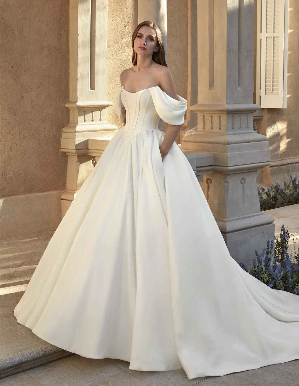 ANABELA jsou honosné svatební šaty z prémiového mikada, které spojují moderní couture estetiku s nadčasovou elegancí. Dominantou je strukturovaný korzet do V v pase s viditelným modelačním šitím a jemně tvarovaným výstřihem.