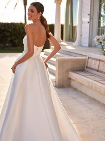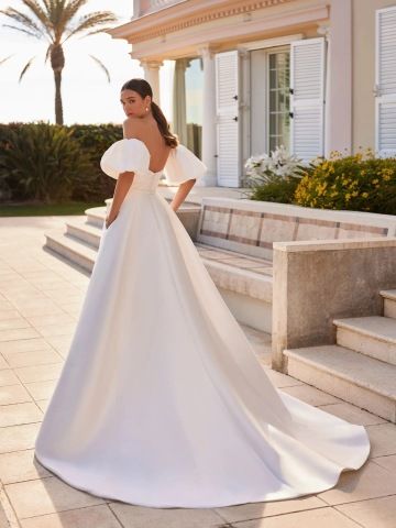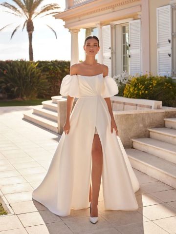 Šaty ANGLESEY zaujmou od prvního pohledu svým moderním střihem a hravými objemnými rukávy. Hladký korzet s trendy výtřihem ve tvaru lžičky elegantně odhaluje dekolt, zatímco balonové rukávy dodávají modelu svěží romantický nádech. Čistá sukně s vysokým rozparkem odhaluje nohy při chůzi a působí odvážně i sofistikovaně zároveň. Perfektní volba pro stylovou nevěstu, která chce vyniknout originalitou a citem pro detail.