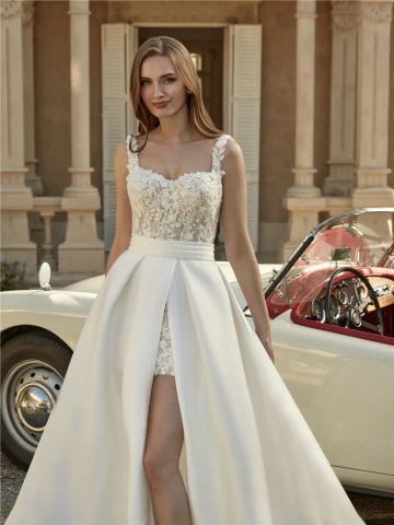 Model BELY spojuje hravou smyslnost a praktičnost v jednom. Bohatě zdobený krajkový korzet s ramínky působí romanticky a svěže. Krátké krajková mini sukně podtrhuje ženské křivky a dodává outfitu ležérní lehkost. Odnímatelná saténová sukně s vysokým rozparkem přináší možnost proměny z velkolepého svatebního looku na pohodlný večerní outfit během několika vteřin.