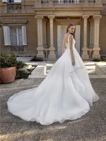 Model BERTHIS okouzlí svou majestátní siluetou a jemnou extravagancí. Hladký živůtek s hranatým výstřihem a širokými ramínky působí moderně a zároveň nadčasově, zatímco široká, vícevrstvá sukně z lehkého organzového materiálu vytváří vzdušný objem a plynulý pohyb při chůzi. Asymetrické kaskádovité vrstvy dodávají šatům originální rozměr a romantický nádech, který podtrhuje dlouhá vlečka. Ideální volba pro nevěstu, která se chce cítit jako moderní princezna.