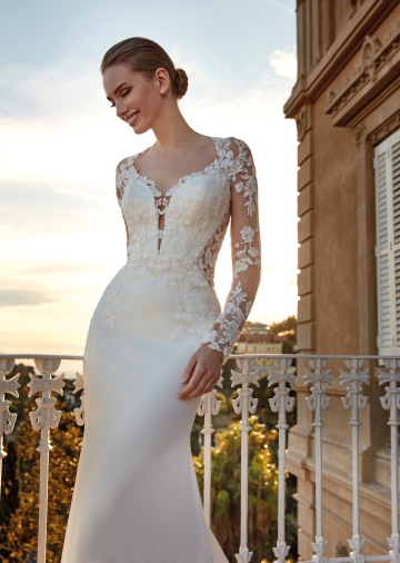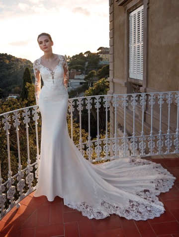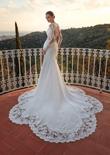 EFFY jsou smyslné svatební šaty v lichotivém střihu „fit & flare“. Hladká sukně z jemného krepového materiálu krásně splývá, zatímco živůtek z průsvitného tylu je bohatě zdobený krajkou s květinami, které plynule přecházejí do dlouhých rukávů. Průsvitné panely na bocích umocňují efekt "přesýpacích hodin". Hluboký výstřih do V vpředu a sexy transparentní záda dodávají modelu odvážný, ale elegantní charakter. Krajková vlečka s jemným vzorem je třešničkou na dortu, která podtrhne romantický půvab těchto šatů.