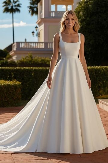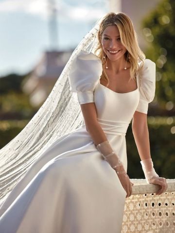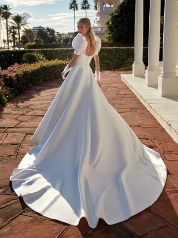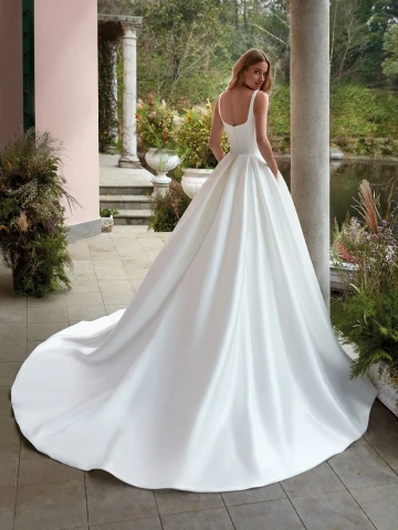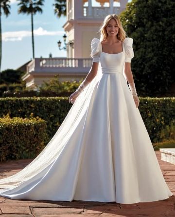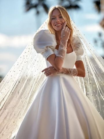 Šaty GRAZIA osloví všechny nevěsty, které milují romantiku s nádechem královské elegance. Hladký korzet se čtvercovým výstřihem a rafinovaným páskem zvýrazňuje pas, zatímco připínací dramatické balónové rukávy přidávají celému modelu šarm a originalitu. Áčková sukně z kvalitního mikáda vytváří dokonalou siluetu a krásně drží tvar. Ideální pro slavnostní obřad na zámku i moderní svatbu s noblesním charakterem.