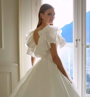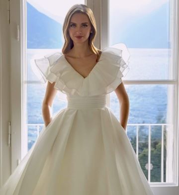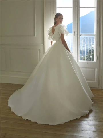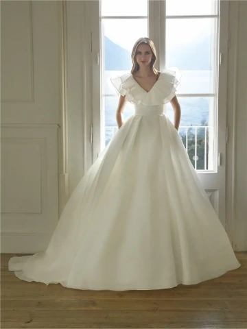 Šaty HARMONI okouzlují svou jemnou romantikou a originálním stylem. Nadýchaná sukně z lehouného organzového saténu plynule přechází do elegantní vlečky, zatímco nápadný živůtek s výstřihem do V zdobí výrazný volán, který rámuje ramena a dodává modelu hravost a něžný půvab. Zadní část šatů se vyznačuje jemným vykrojením a pokračováním volánů, které vytvářejí nezapomenutý pohled při každém otočení. Tento model je ideální volbou pro nevěstu, která hledá spojení moderní jednoduchosti s hravou ženskostí.