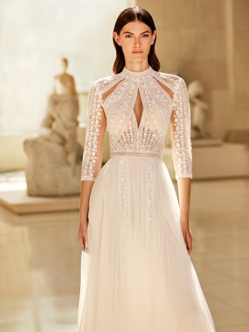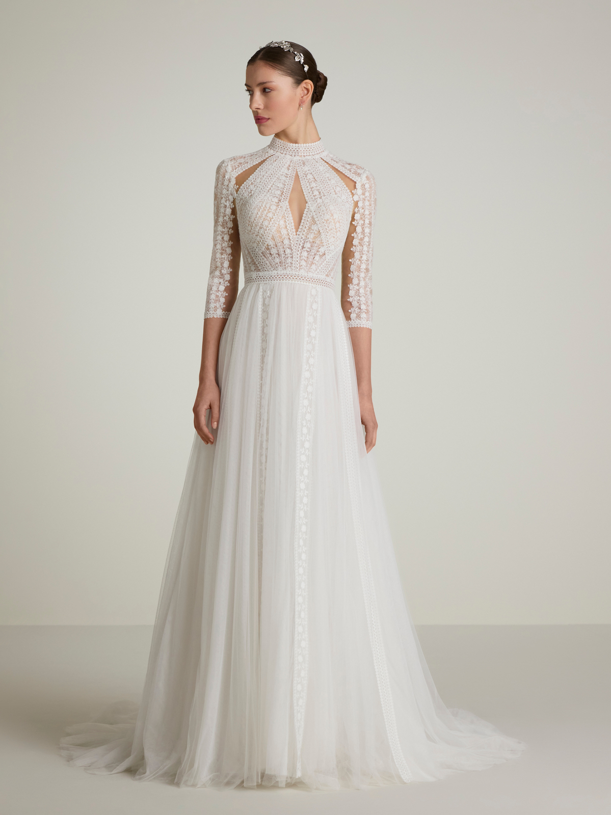 ITZIAR jsou elegantní svatební šaty s boho chic charakterem, které zaujmou precizně zpracovaným krajkovým živůtkem a rafinovanými detaily. Vyšší stojáček plynule přechází do úzkého svislého průstřihu ve výstřihu, který opticky prodlužuje siluetu a dodává modelu moderní výraz.