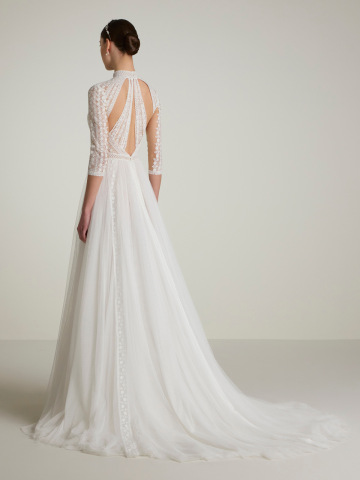 Vzdušná tylová sukně v linii A splývá od pasu v měkkých vrstvách a přechází do jemné vlečky. ITZIAR jsou ideální volbou pro nevěstu, která hledá nadčasovou eleganci, jemnou smyslnost a vytříbený couture detail.