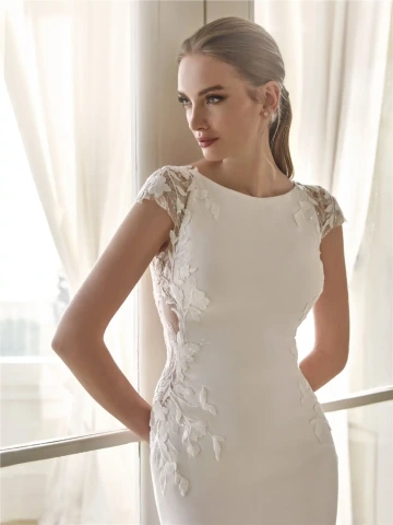 Elegantní svatební šaty JENESIS v minimalistickém střihu, které dokonale zvýrazňují ženskou siluetu. Hladká přiléhavá sukně z jemného krepu plynule splývá do decentní vlečky, zatímco živůtek s jemnými krajkovými aplikacemi a průhlednými krajkovými kimono rukávky dodává modelu romantický nádech. Průsvitná záda s třpytivými krajkovými motivy a knoflíčkovým zapínáním působí smyslně a sofistikovaně. Ideální volba pro nevěstu, která hledá moderní čistotu s jemným dotekem luxusu.