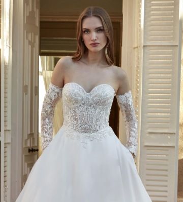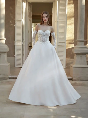 Model LIHI přináší dokonalou harmonii romantiky a sofistikovanosti. Korzetový živůtek s jemným srdíčkovým výstřihem a bohatým krajkovým zdobením smyslně obepíná postavu, zatímco dlouhé, odnímatelné rukávy z krajky dodávají šatům královský nádech. Hladká mikádová sukně v áčkovém střihu s kapsami a dlouhou vlečkou působí majestátně a elegantně. Tyto šaty jsou ideální volbou pro nevěstu, která chce spojit půvab jemných detailů s noblesou klasického střihu.