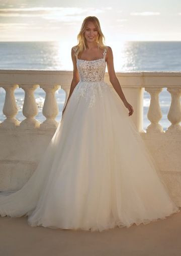 Šaty MADELEINE přinášejí nadýchanou romantiku v její nejčistší podobě. Bohatá tylová sukně s dlouhou vlečkou vytváří snový objem, zatímco jemně vyšívaný krajkový korzet s ramínky a květinovým vzorem krásně zvýrazňuje dekolt a přirozeně přechází do zadního prohloubeného výstřihu. Ideální volba pro nevěstu, která sní o pohádkové svatbě v přírodě nebo na zámku.