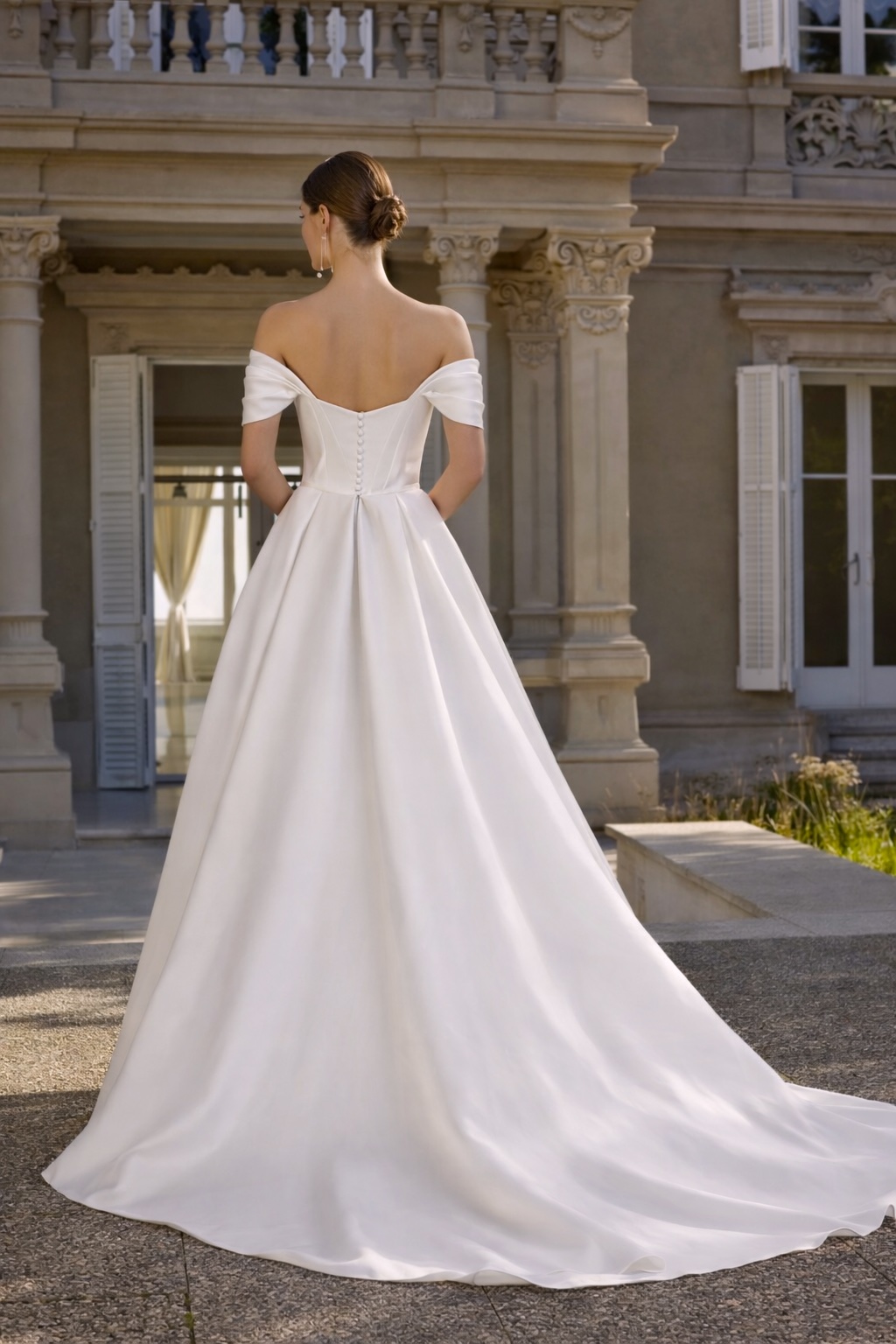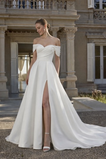 Šaty MARLENE jsou elegantní a zároveň smyslné, jsou dokonalou volbou pro nevěstu s citem pro styl a šarm. Hladký korzet se spadenými rukávky a efektním řasením vytváří nadčasově ženskou siluetu, zatímco dramatický rozparek na áčkové sukni přidává moderní a odvážný akcent. Luxusní hladké mikado propůjčuje modelu strukturovaný objem a noblesní vzhled.