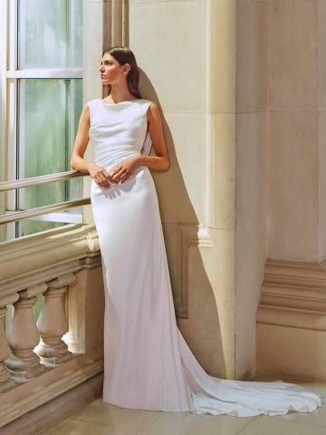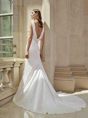 Sofistikovanost a půvab se spojují a vdechují život modelu MEDIVA. Tyto šaty jsou vyrobeny z luxusní strečové saténové látky a mají elegantní výstřih ve tvaru lodičky a výrazná hluboká záda lemovaná efektní vodou, která se v kombinaci s úzkou sukní ve střihu mořské panny vytvářejí rafinovaný a lichotivý vzhled.