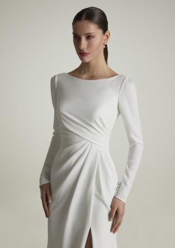 Sofistikované svatební šaty METTE je ideální pro nevěsty, které chtějí oslnit svou jednoduchostí a elegancí. Tento plně krepový model ve střihu mořské panny se vyznačuje výstřihem ve tvaru lodičky, hlubokými kulatými zády, dlouhými přiléhavými rukávy a lichotivým skládaným detailem, který se sbíhá v pase a dodává designu zvláštní nádech. Sexy rozparek na nohu dodává sukni větší volnost pohybu.