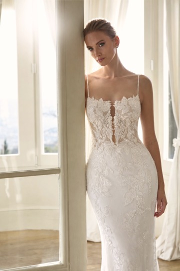 Model NYDRI je oslavou ženské siluety a smyslné elegance. Úzký střih typu mořské panny z jemné krajky bohatě zdobené květinovými aplikacemi a třpytivými flitry krásně obepíná postavu a zvýrazňuje křivky. Korzetový živůtek s tenkými ramínky a hlubokým iluzním výstřihem dodává modelu svůdný nádech, zatímco dlouhá krajková vlečka přináší element dramatičnosti a luxusu. Perfektní volba pro nevěsty, které chtějí působit sofistikovaně, odvážně a nezapomenutelně.