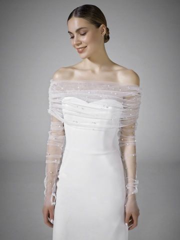Šaty QUEEN jsou skutečným šperkem mezi svatebními modely. Celé šaty jsou vyrobené z třpytivého glitrového tylu a jsou poseté jemnými perličkami, které vytvářejí okouzlující efekt při každém pohybu. Korzet bez ramínek s jemným řasením krásně zvýrazňuje dekolt a přechází do bohaté tylové sukně s impozantní vlečkou. Tento model je ideální pro nevěstu, která si přeje zazářit a cítit se jako moderní princezna.