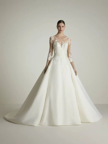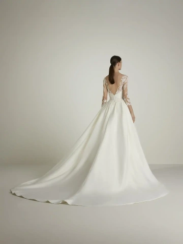Šaty RIVERES kombinují tradici a romantismus. Mají slušivý áčkový střih vyrobený z lehkého a elegantního piké, zdobený elegantními krajkovými detaily na živůtku a bocích. Průsvitné detaily ve výstřihu, rukávech a na zádech dodávají šatům jemnost a dokonale je doplňuje hladká sukně, ke které lze pro ještě větší efekt přidat odnímatelnou vrchní sukni s dlouhou vlečkou.