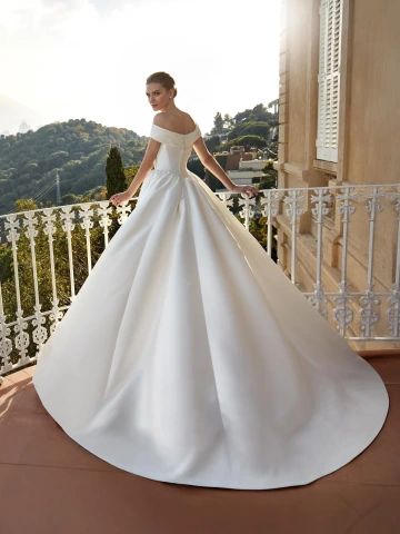 Hladká, bohatá sukně z luxusního mikada působí vzdušně a lehce, přesto si zachovává strukturu a objem. Vysoký rozparek dodává šatům pohyb, špetku smyslnosti a výrazný efekt při chůzi i tanci. TENLEY jsou ideální volbou pro nevěstu, která chce nadčasový, sofistikovaný look s výraznou siluetou a bez zbytečných ozdob.