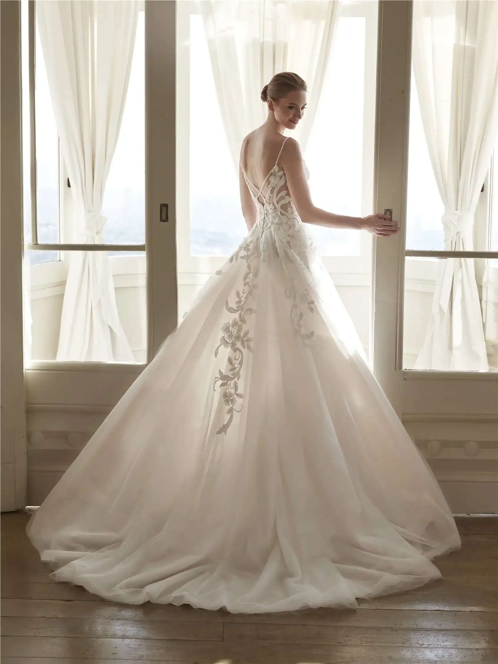 Model TERRI je ztělesněním jemné romantiky a moderní lehkosti. Korzet s tenkými ramínky zdobí bohatá krajková výšivka s květinovými motivy, která plynule přechází do jemné tylové sukně v áčkovém střihu. Průsvitné boční panely a hlubší výstřih dodávají šatům nádech smyslnosti, zatímco vzdušná vícevrstvá sukně zajišťuje nebesky lehký pohyb. Vzadu odhalují šaty elegantní vykrojení se subtilním ramínkovým křížením a kratší vlečkou, která celkovému vzhledu propůjčuje královskou eleganci.