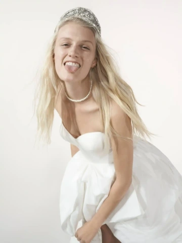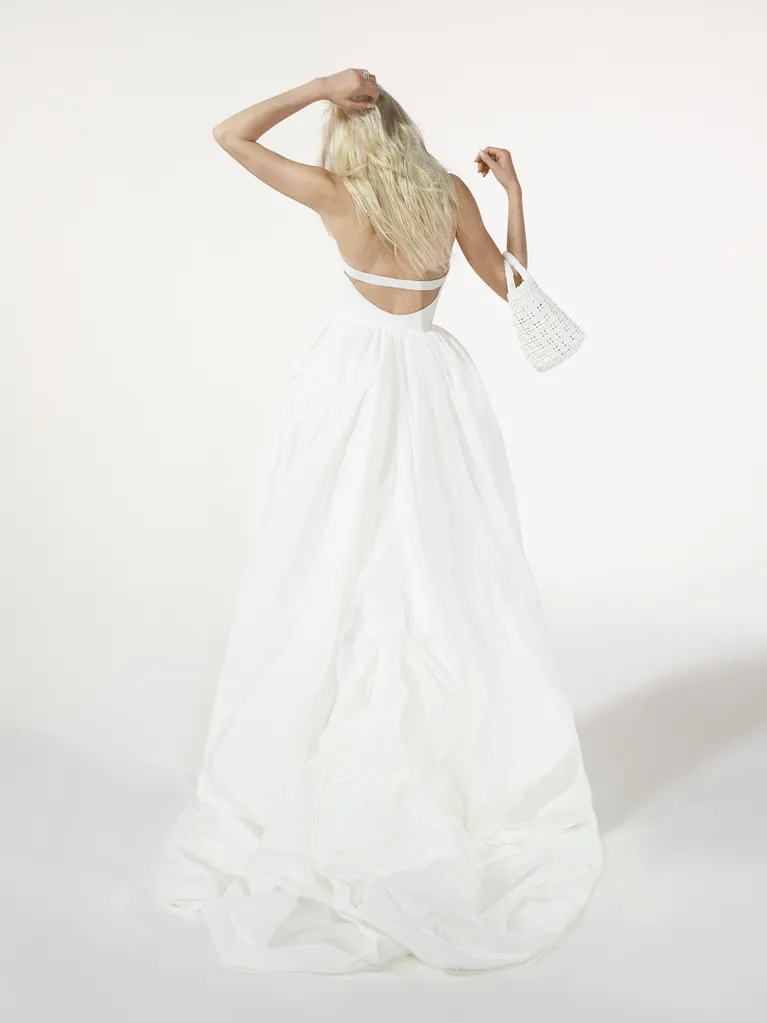 Lehoučké svatební šaty Vera Wang BONITA z nadýchaného taftu v čistém, minimalistickém stylu. Hravá oversize mašle a výrazná silueta "hi-lo", neboli vpředu párty, vzadu business.