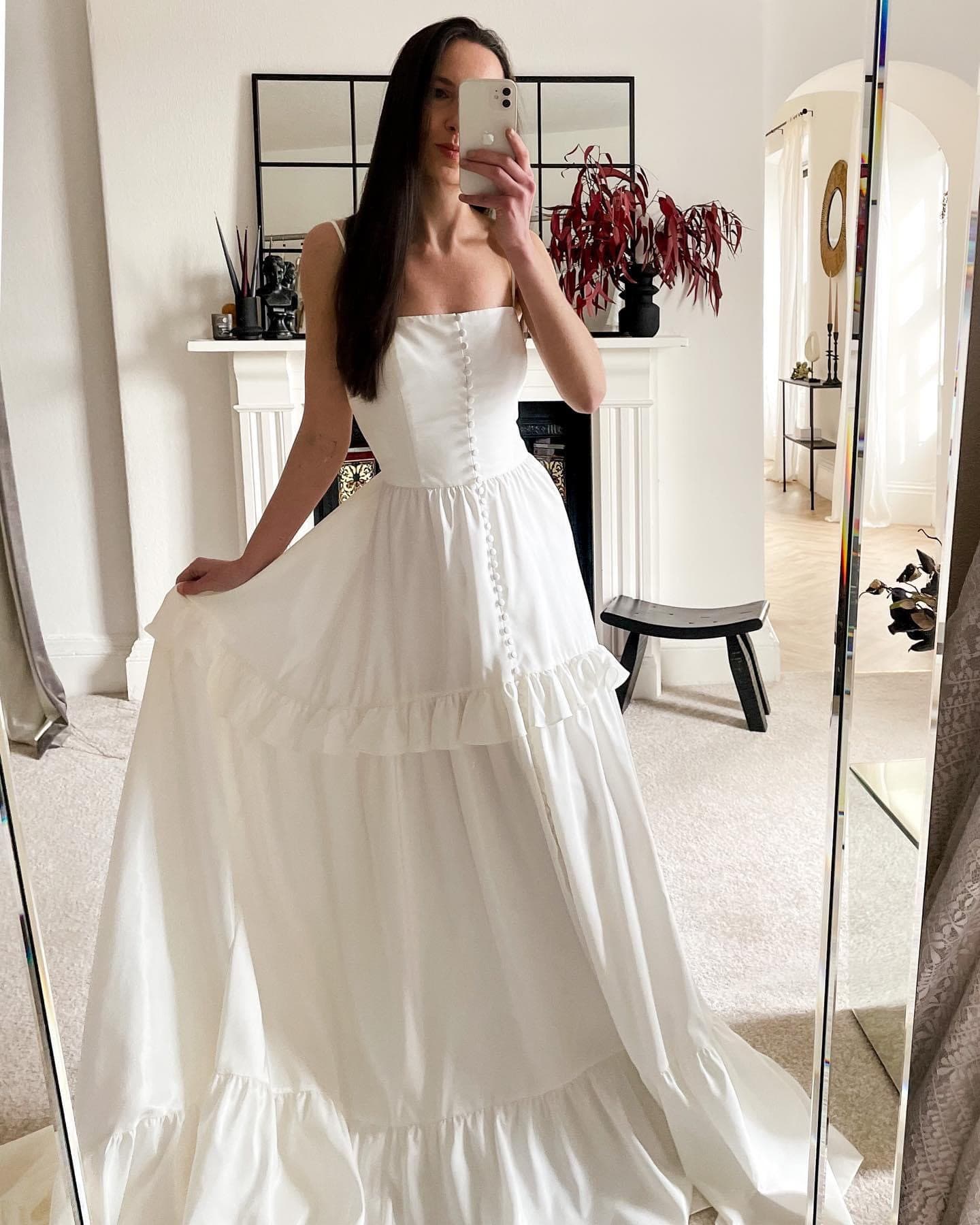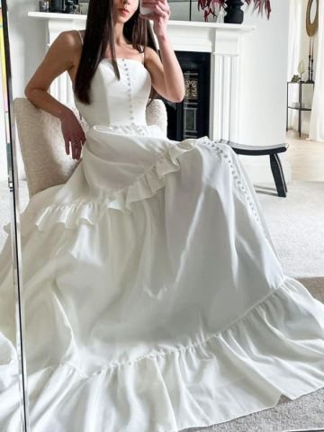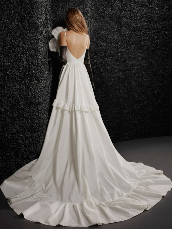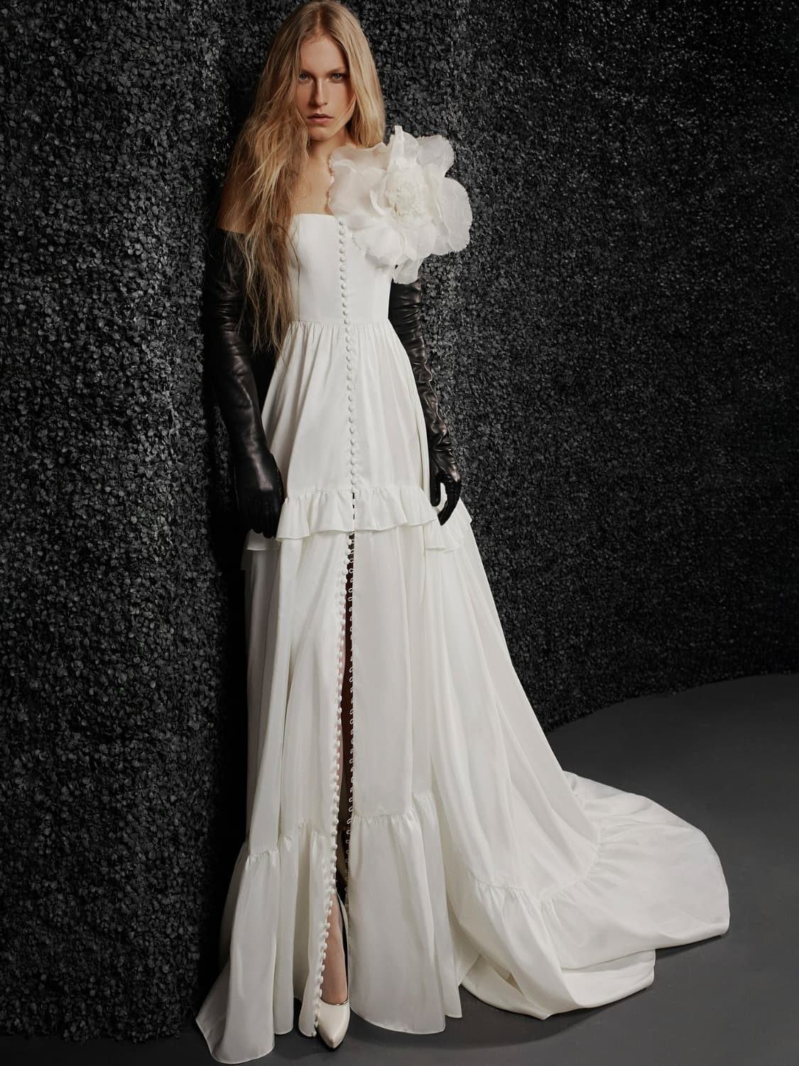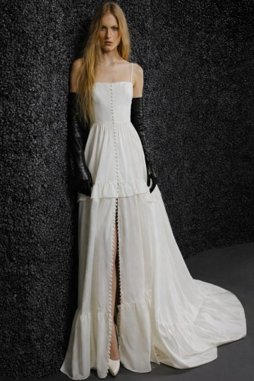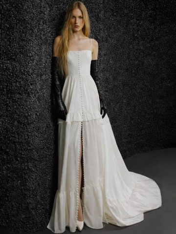 Knoflíčková linie po celé délce předního dílu přidává vintage kouzlo, zatímco kanýrové zakončení sukně a hluboký výstřih na zádech odhalují typický rukopis Very Wang – ženskost s kapkou rebelie. Ideální pro nevěstu, která miluje nenucenou eleganci s dotekem francouzské nonšalance.