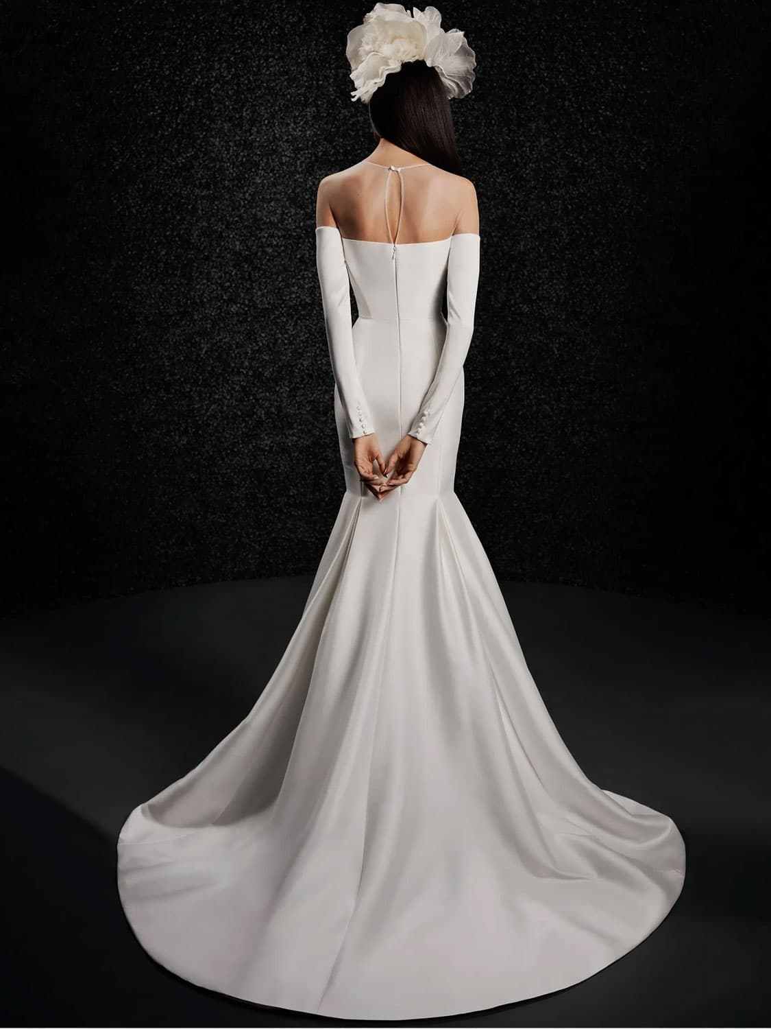 Dlouhé rukávy padající z ramen vytvářejí neodolatelný kontrast mezi strukturou a jemností, zatímco hladká vlečka přidává modelu majestátnost. Ideální pro nevěstu, která chce být nezapomenutelná – elegantní, sebevědomá a naprosto současná.