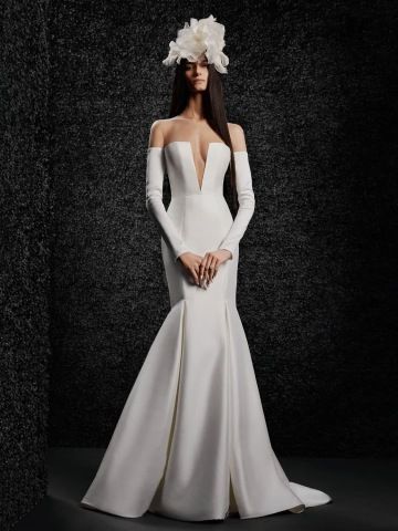 Ikonický model z dílny Vera Wang Bride, který spojuje dramatickou eleganci s moderní smyslností. Šaty MISHELL z elastického mikada zaujmou dokonalou siluetou typu mořská panna, hlubokým výstřihem s jemným illusion tylem a výrazně tvarovaným živůtkem, který zvýrazní ženské linie s architektonickou precizností.