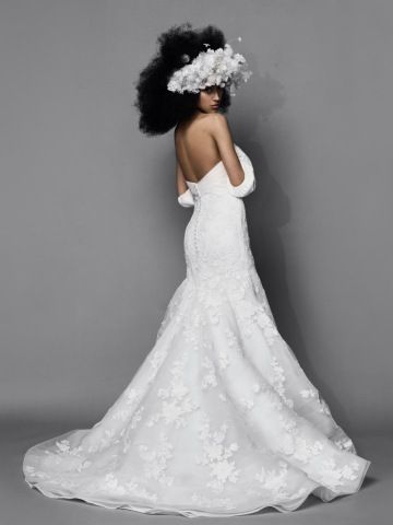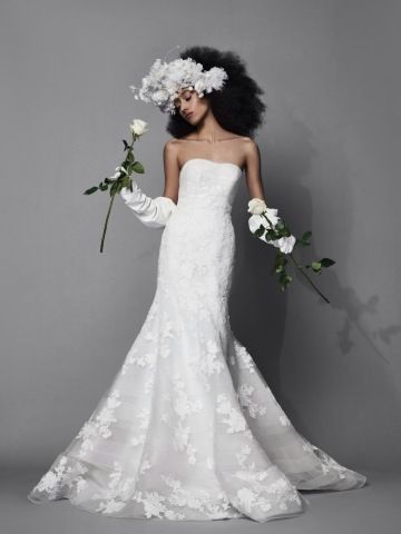Stylové svatební šaty Vera Wang RONNIE z pera světově vyhlášené módní návrhářky Very Wang. Korzetový živůtek bez ramínek s rovným výstřihem zdobený krajkou pozvolna přechází do přiléhavé sukně trumpetového střihu s elegantní vlečkou.