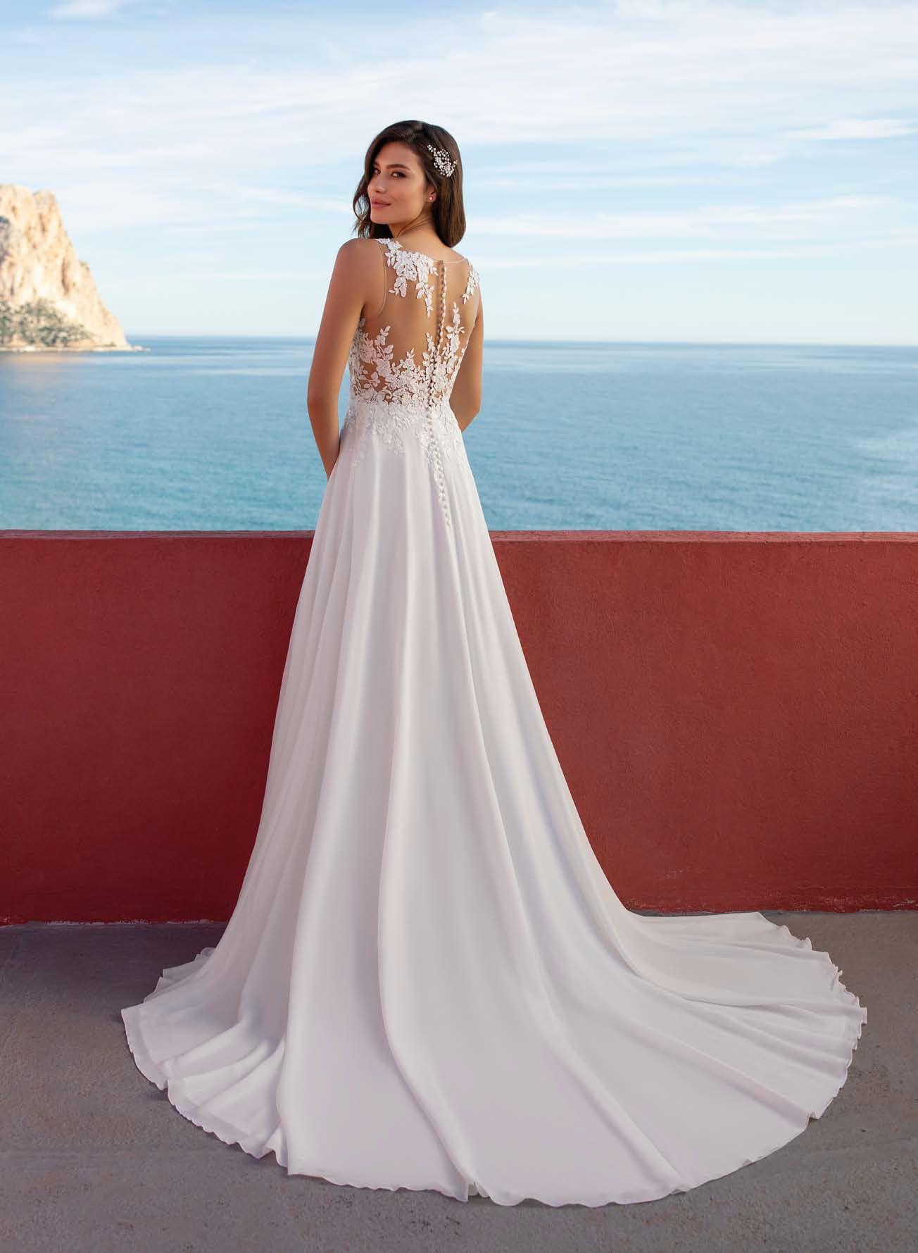Výrazným detailem je vysoký rozparek, který dodává modelu moderní nádech a zároveň krásně prodlužuje siluetu. Průhledná záda s krajkovými aplikacemi podtrhují romantický charakter šatů a vytvářejí působivý kontrast k jednoduché linii sukně. AMA jsou ideální volbou pro nevěsty, které hledají lehké, elegantní a přirozeně svůdné svatební šaty – perfektní pro letní svatby i obřady u moře.