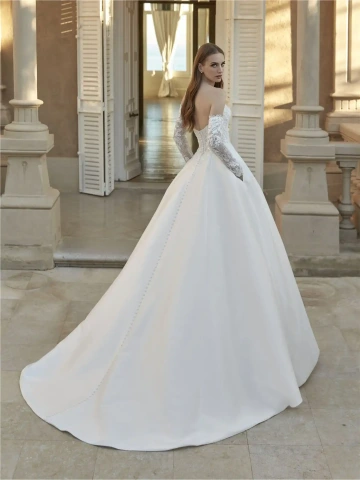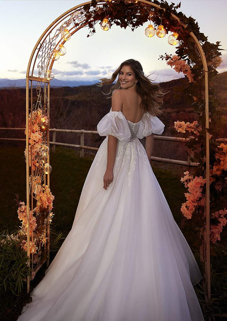 Odnímatelné nabírané rukávy z organzy dodávají šatům hravý a ženský nádech — můžete je mít pro obřad i bez nich pro tanec. Kombinace měkké bavlněné krajky, ručně vyšívaných detailů a objemné sukně vytváří vzhled, který působí okouzlujícím dojmem při západu slunce i pod hvězdami.
