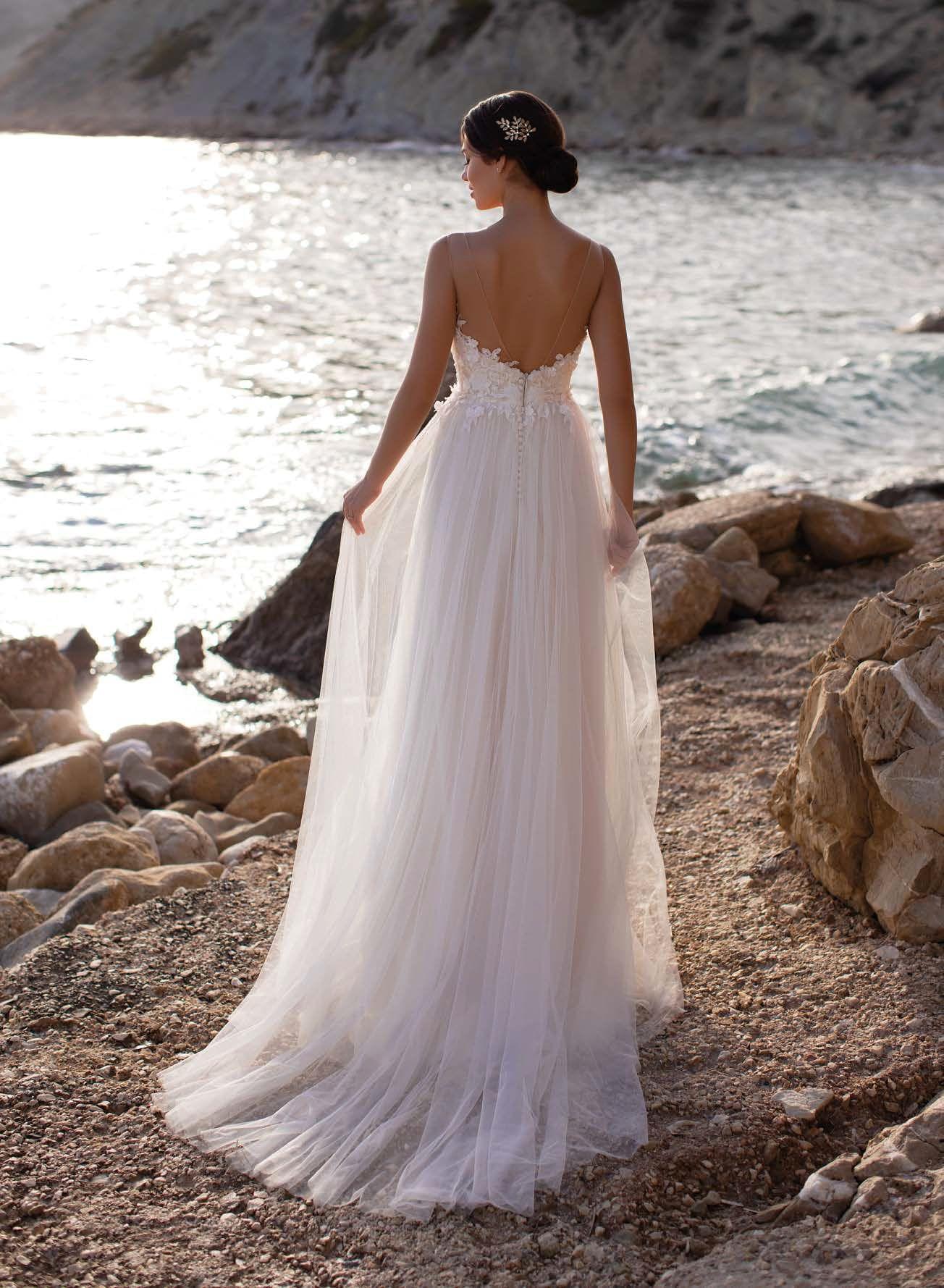 Záda zdobí jemné ramínka a hlubší vykrojení, jež podtrhuje eleganci siluety a dodává modelu smyslný, ale stále velmi romantický charakter. Ideální volba pro nevěsty toužící po lehkosti, přirozenosti a nadčasové kráse.