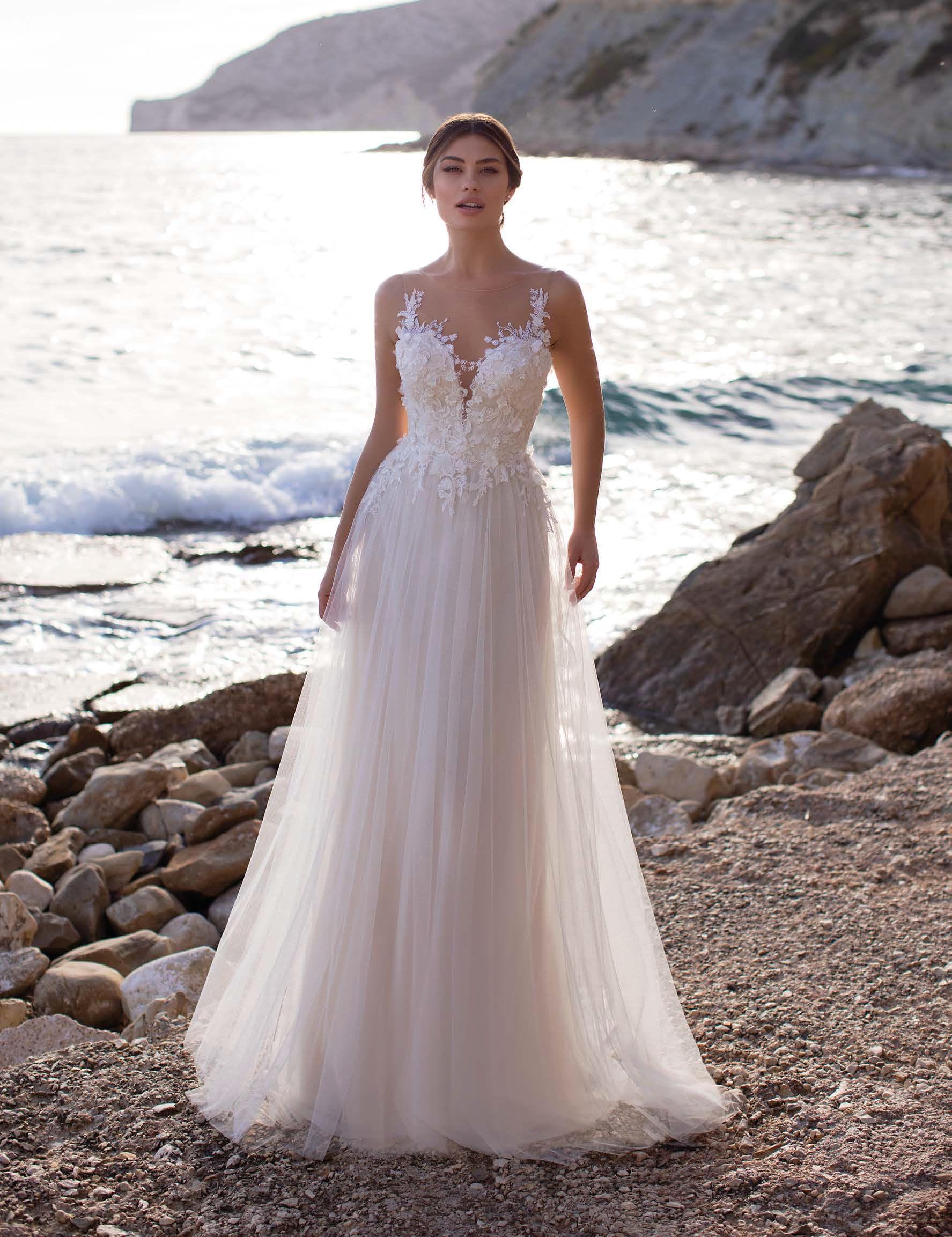Svatební šaty BETHANY působí lehce, étericky a velmi ženským dojmem. Jemně průsvitný krajkový živůtek s bohatou florální aplikací navazuje na hlubší výstřih, který je zjemněn tělovým tylem. Krajka přirozeně přechází do vzdušné tylové sukně v áčkové linii s krátkou vlečkou.