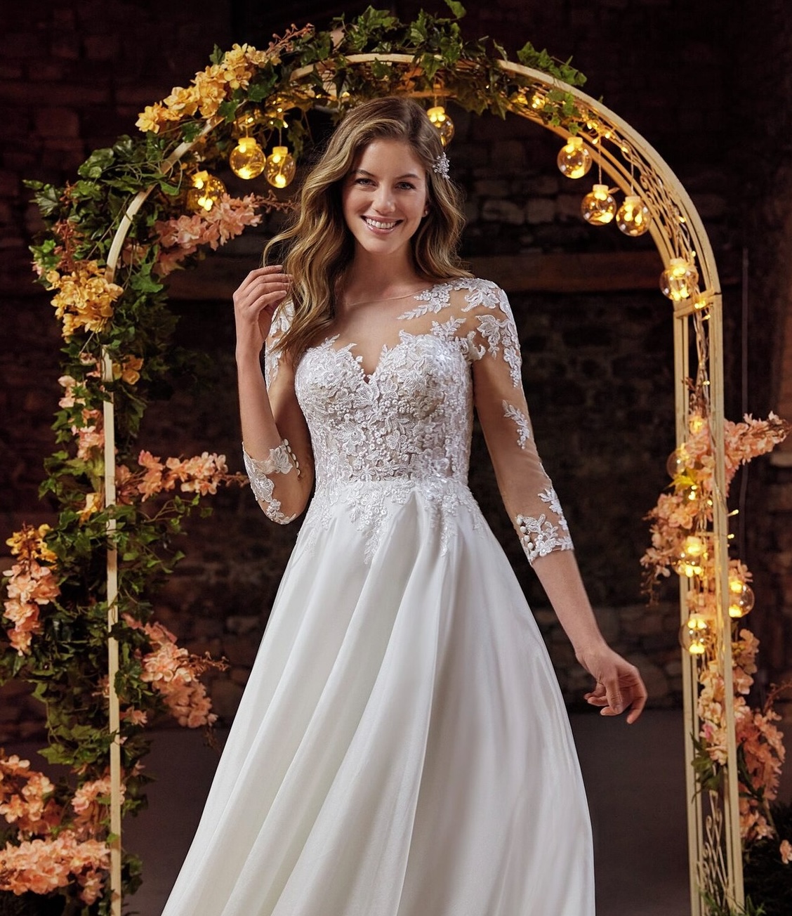 Model BOLINGO působí jako zhmotněná romantika. Korzet z třpytivé krajky s 3/4 rukávy krásně obepíná siluetu a vytváří elegantní dekolt, zatímco tylová princeznovská sukně působí vzdušně a něžně. Transparentní záda zdobená krajkovými aplikacemi a knoflíčky dodávají šatům jemný nádech smyslnosti. Tento model je ideální pro nevěstu, která hledá spojení klasické elegance a moderní ženskosti.