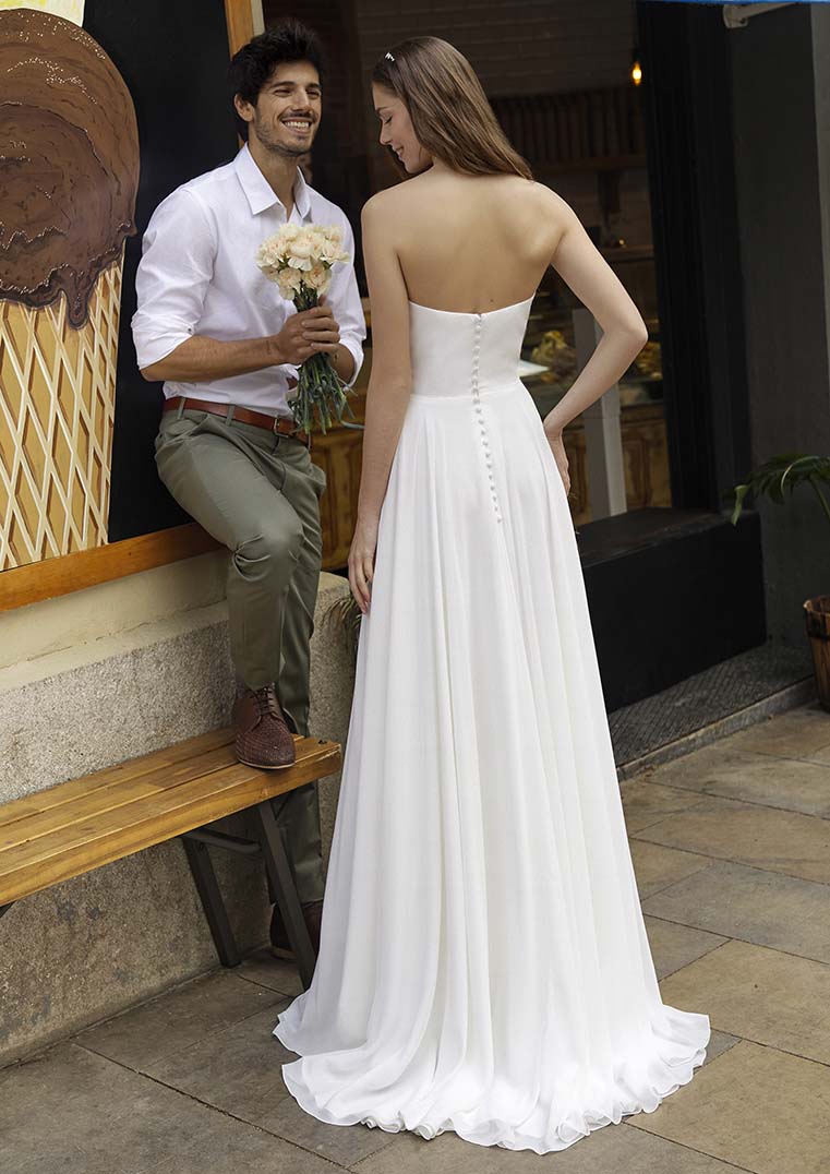 Záda zdobí decentní linie potahovaných knoflíčků, které dotvářejí romantický dojem. Tyto šaty jsou ideální volbou pro nevěsty, které milují minimalistický styl s důrazem na lehkost, přirozenost a nenucenou krásu.