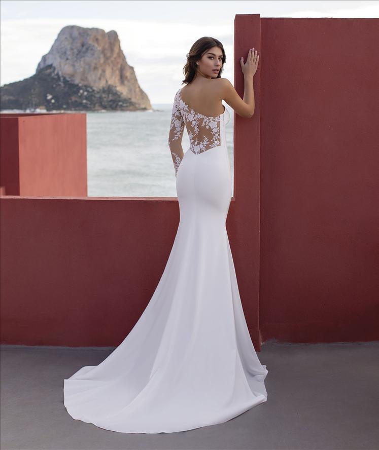 CLOVER jsou minimalistické, ale výrazné svatební šaty pro nevěstu, která chce čistou siluetu s jedním silným designovým akcentem. Asymetrický živůtek na jedno rameno vytváří moderní a velmi elegantní linii, zatímco paži zdobí jemně transparentní krajkový rukáv s květinovou výšivkou, který šatům dodává romantický kontrast.