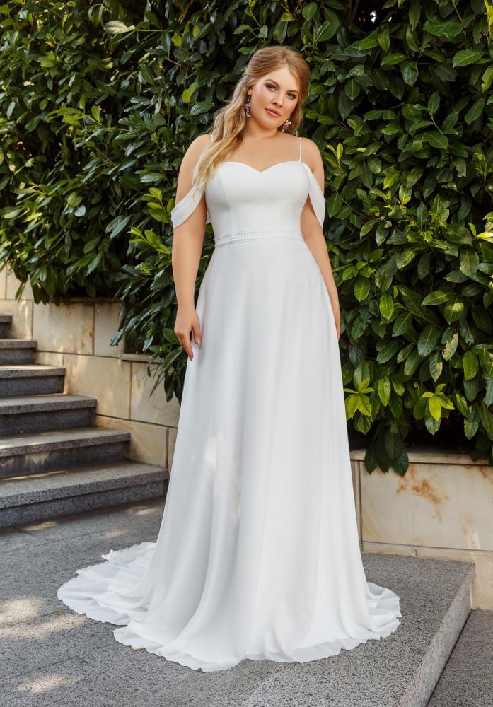 Jemná ramínka a minimalistický střih zvýrazňují ženskou siluetu bez zbytečných ozdob, což dává vyniknout přirozené kráse nevěsty. Ideální volba pro svatbu v přírodě, u moře nebo v letním městském prostředí, kde vynikne lehkost a nenucená elegance tohoto modelu.