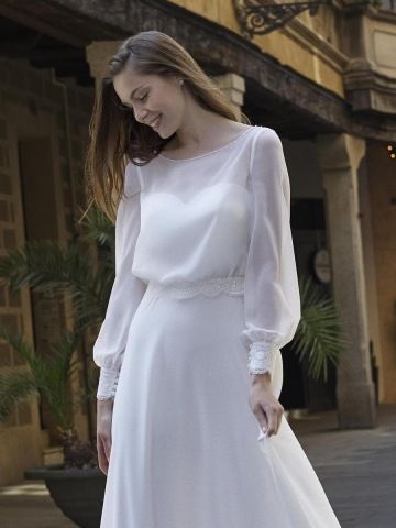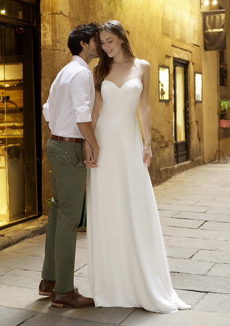 Lehké, vzdušné a naprosto přirozené – svatební šaty ESHA jsou ztělesněním moderní jednoduchosti s nádechem romantiky. Hladký krepový živůtek se srdíčkovým výstřihem plynule přechází do padavé áčkové sukně, která v pohybu nádherně splývá.