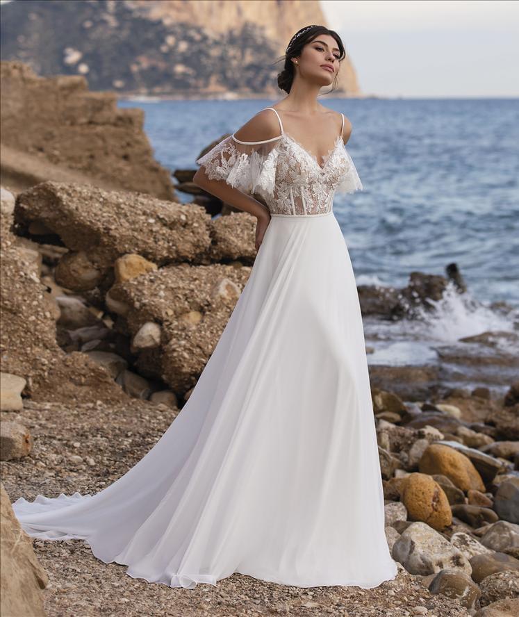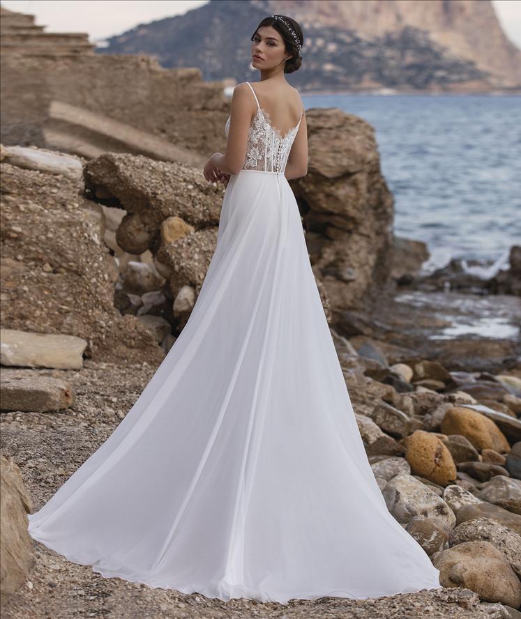 Splývavá sukně z jemného šifonu se pohybuje s každým krokem a působí vzdušně a elegantně. Zadní výstřih s krajkou a knoflíčky podtrhuje ženskost a čistou linii zad. HEATH jsou ideální volbou pro nevěsty, které chtějí působit přirozeně, romanticky a nenuceně luxusně – ať už na pláži, v zahradě nebo při letní svatbě pod širým nebem.