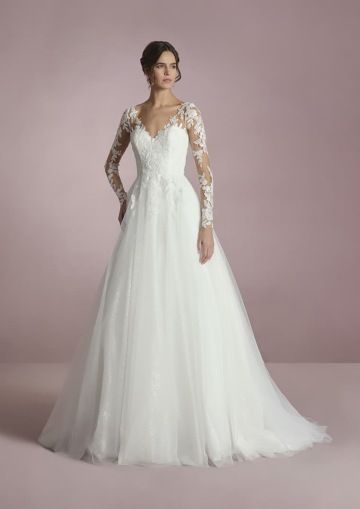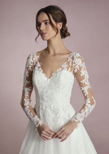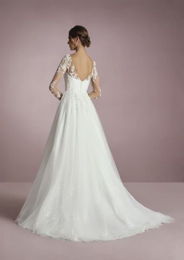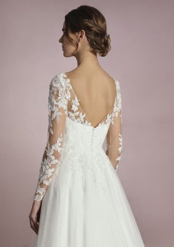 Model KIRI je ideální pro nevěsty, které chtějí ve svůj velký den zazářit. Živůtek má výstřih do V, z něhož vystupují vyšívané průsvitné detaily a prodlužují se do sofistikovaných dlouhých rukávů. Princeznovská sukně je naopak z tylu s třpytivým povrchem, který dokonale doplní přirozený lesk nevěsty.