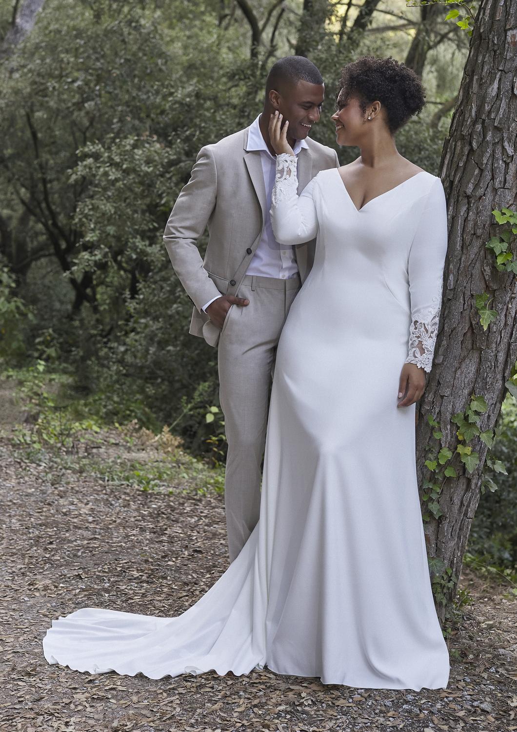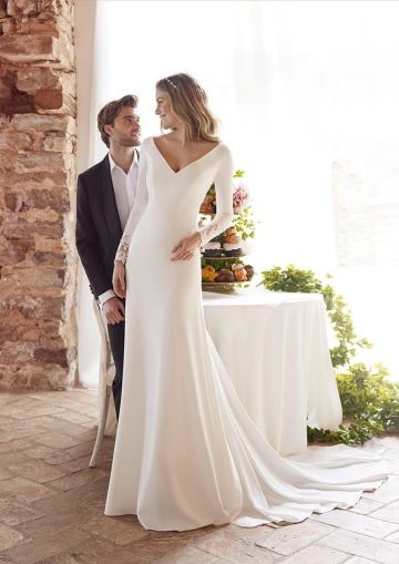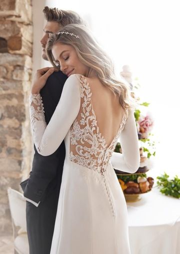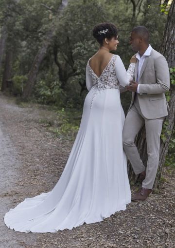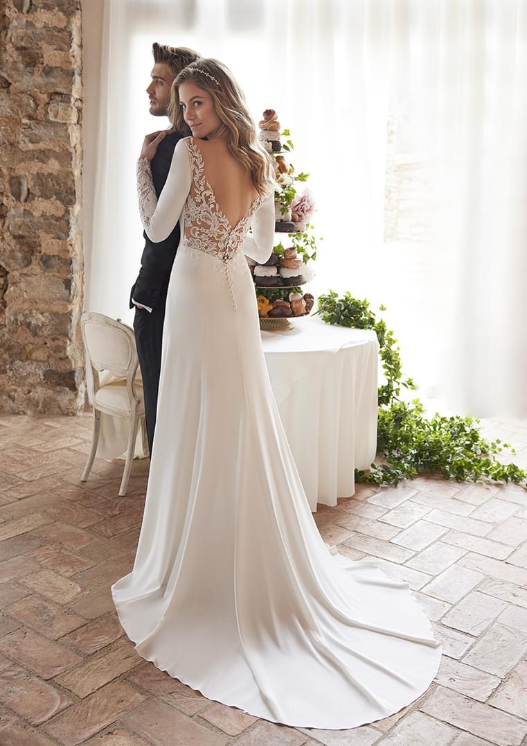 Model MAITASUN spojuje noblesu čistých linií s jemností krajkových detailů. Hladká krepová sukně elegantně splývá k zemi a nechává vyniknout ženské siluetě, zatímco živůtek s výstřihem do V a dlouhými rukávy zaujme rafinovanou kombinací jednoduchosti a romantiky.
