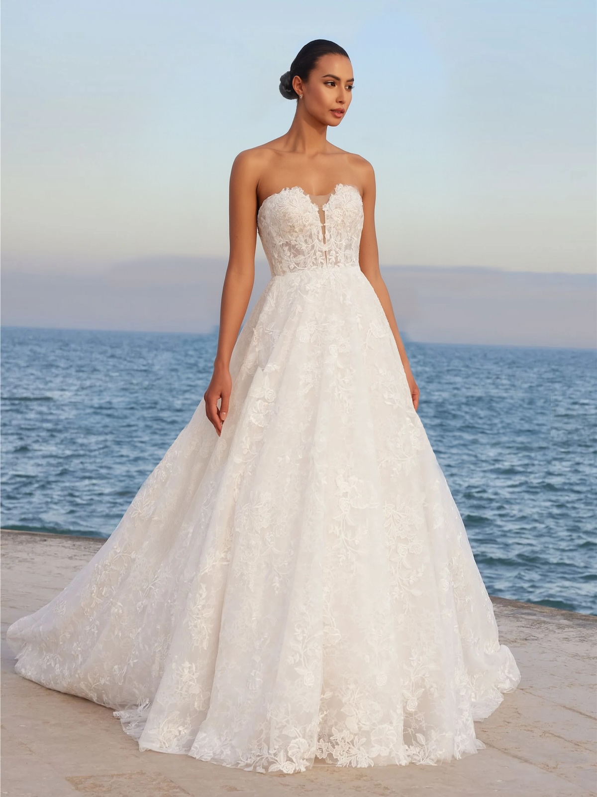 MEGNA jsou romantické princeznovské šaty s korzetem bez ramínek ve tvaru měkkého, prodlouženého srdíčka a jemným transparentním vykrojením uprostřed. Bohatá sukně je celoplošně zdobena vyšívanou krajkou, která působí étericky a zároveň velmi luxusně.