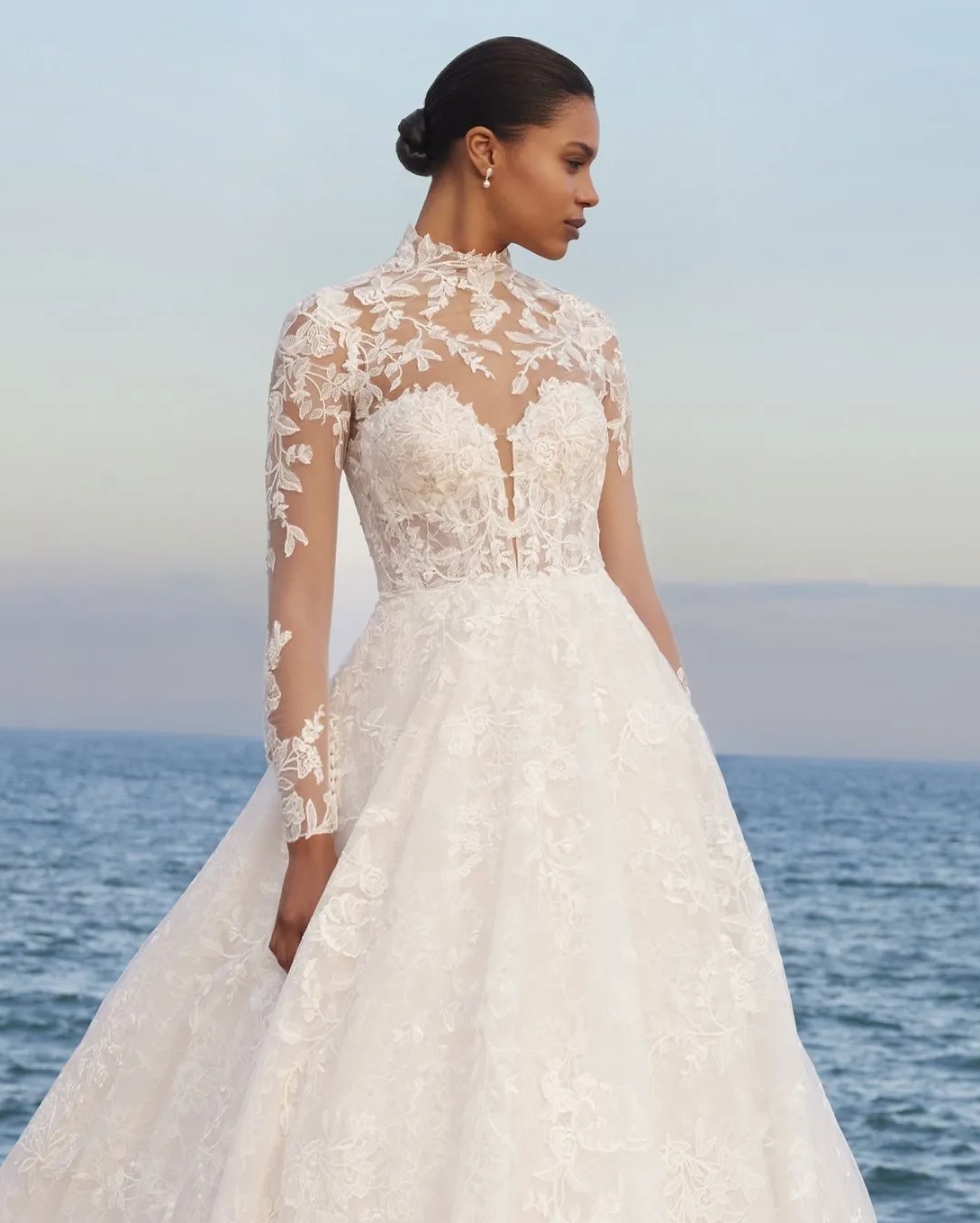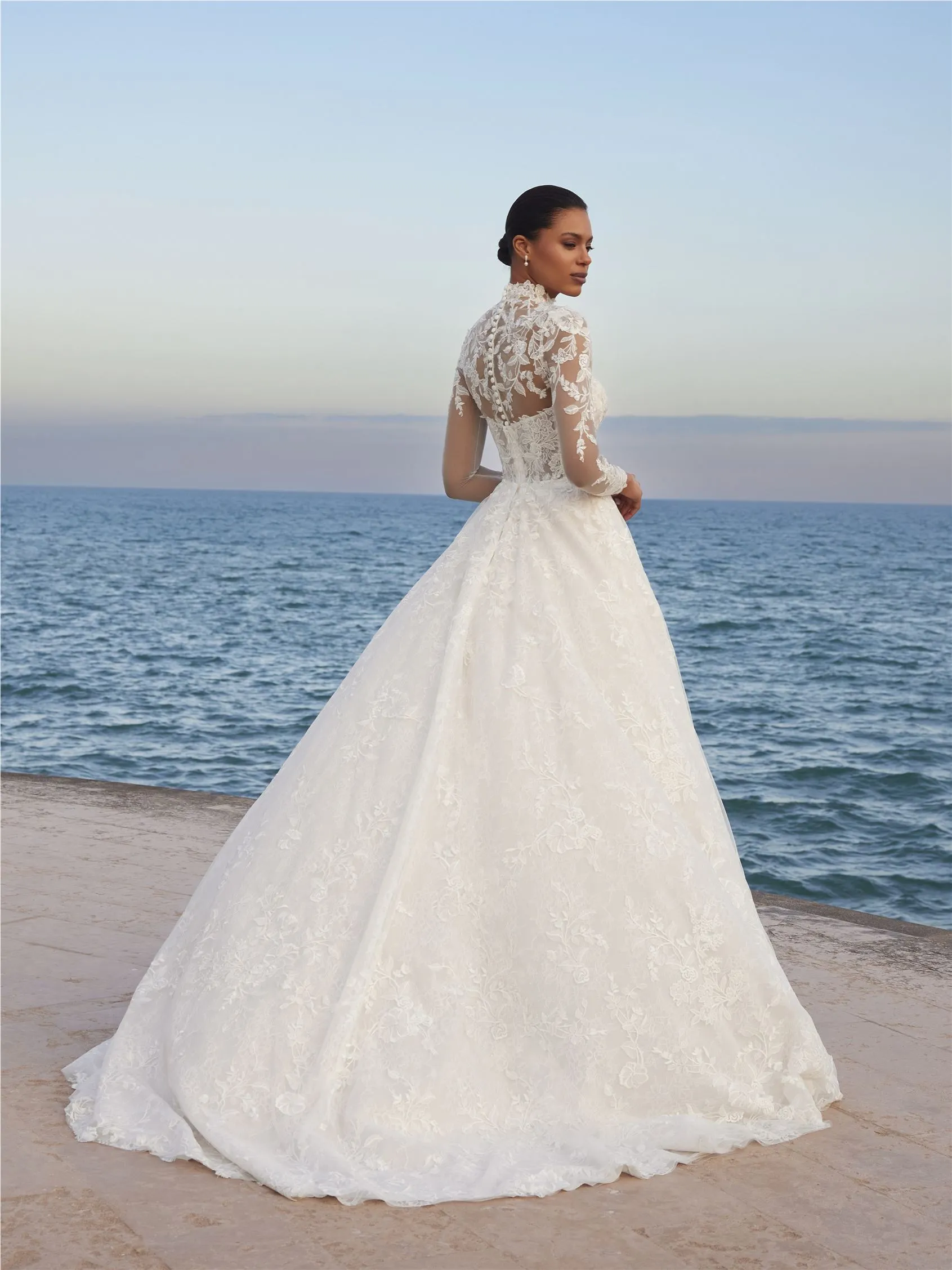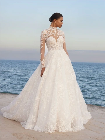 Unikátním prvkem modelu je odnímatelný krajkový top s dlouhými rukávy, stojáčkem a sofistikovaným transparentním efektem. Top okamžitě promění siluetu v královsky formální look – ideální pro obřad – a přitom umožňuje večer odhalit čistý, romantický korzet bez ramínek.
