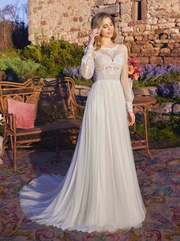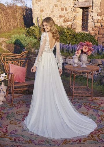 Romantické svatební šaty MILOVAT, které působí jemně a něžně, a přesto mají výraznou eleganci. Živůtek zdobí decentní krajka s květinovým vzorem, která se lehce prolíná do tylové sukně. Vzadu překvapí rafinovaný hlubší výstřih, jenž dodává modelu odlehčený a smyslný nádech. Lehoučká sukně z jemného puntíkového tylu krásně splývá a vytváří vzdušný, snový efekt. Perfektní volba pro nevěstu, která hledá něhu, bohémskou lehkost a romantiku.