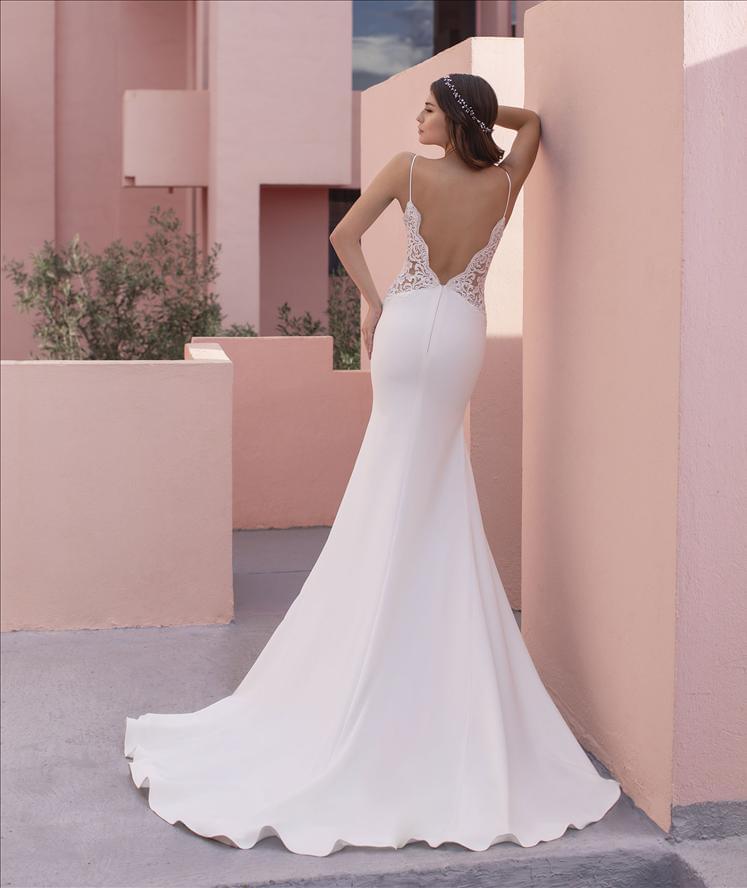 Živůtek na ramínka je tvořen transparentním tylem s bohatou krajkovou výšivkou, která opticky tvaruje pas a přirozeně navazuje na hladkou sukni. Hluboký výstřih do V s jemnými ramínky působí smyslně, ale stále velmi sofistikovaně. Otevřená záda s krajkovými aplikacemi a čistým zakončením podtrhují moderní, couture charakter modelu.
