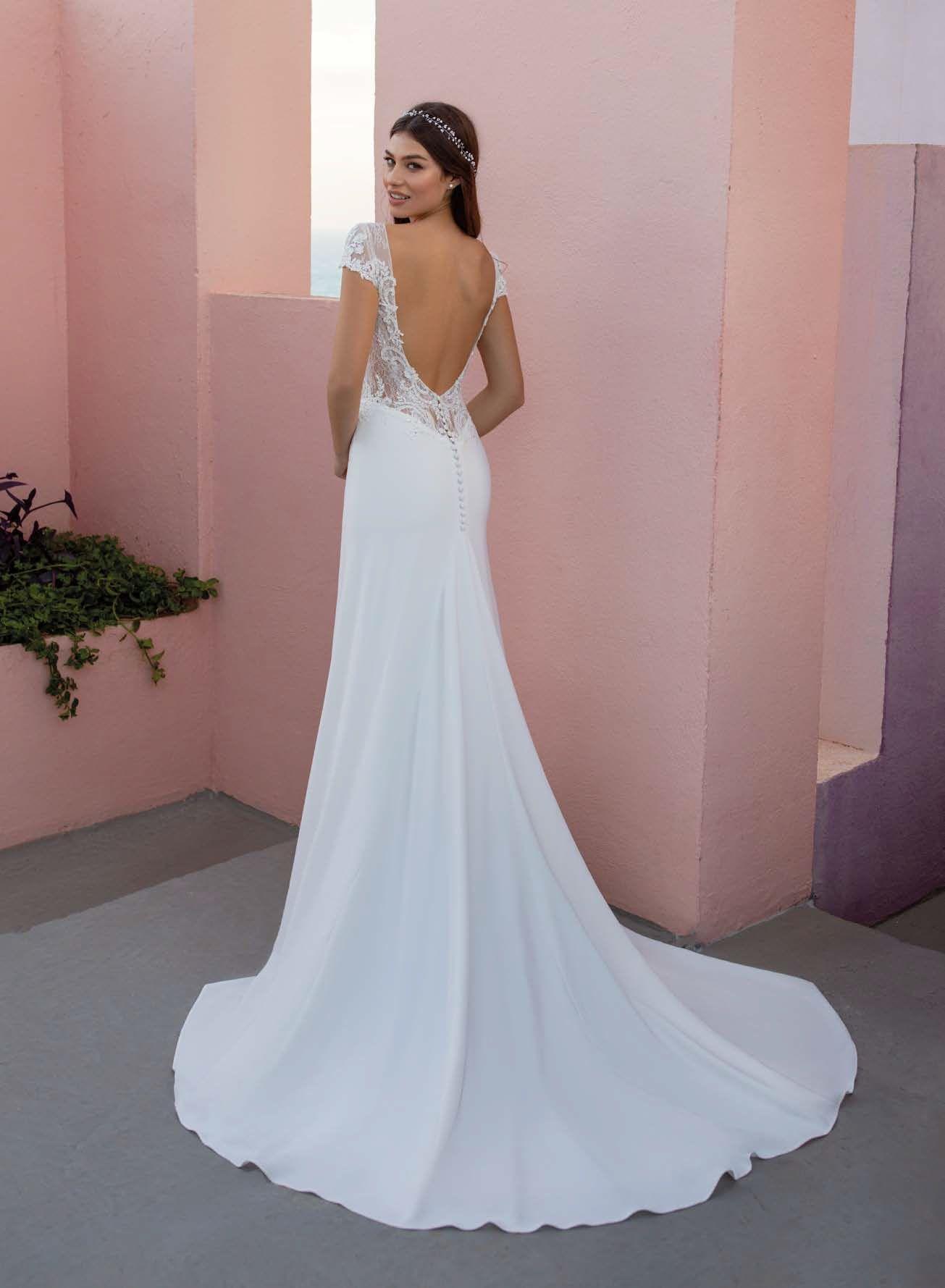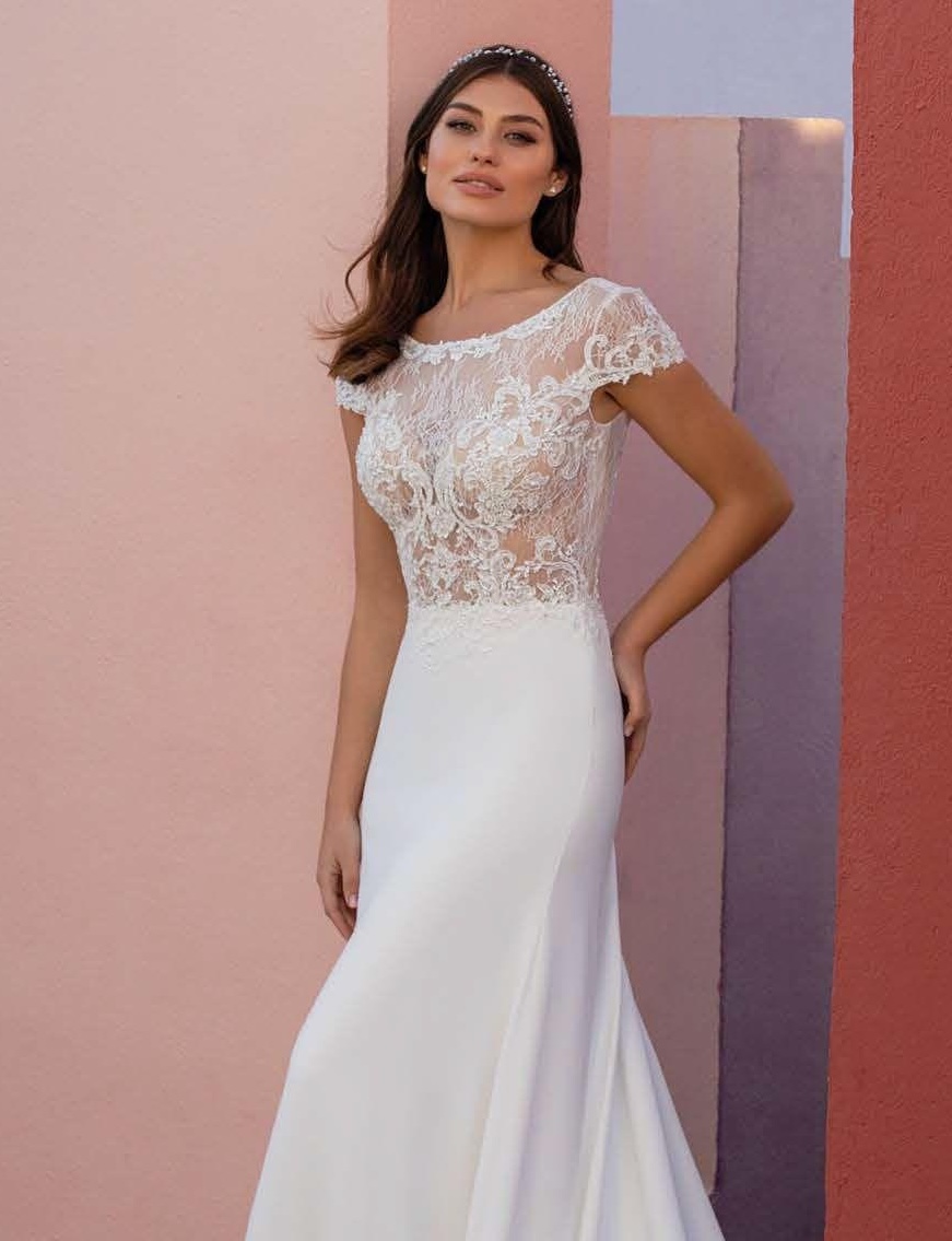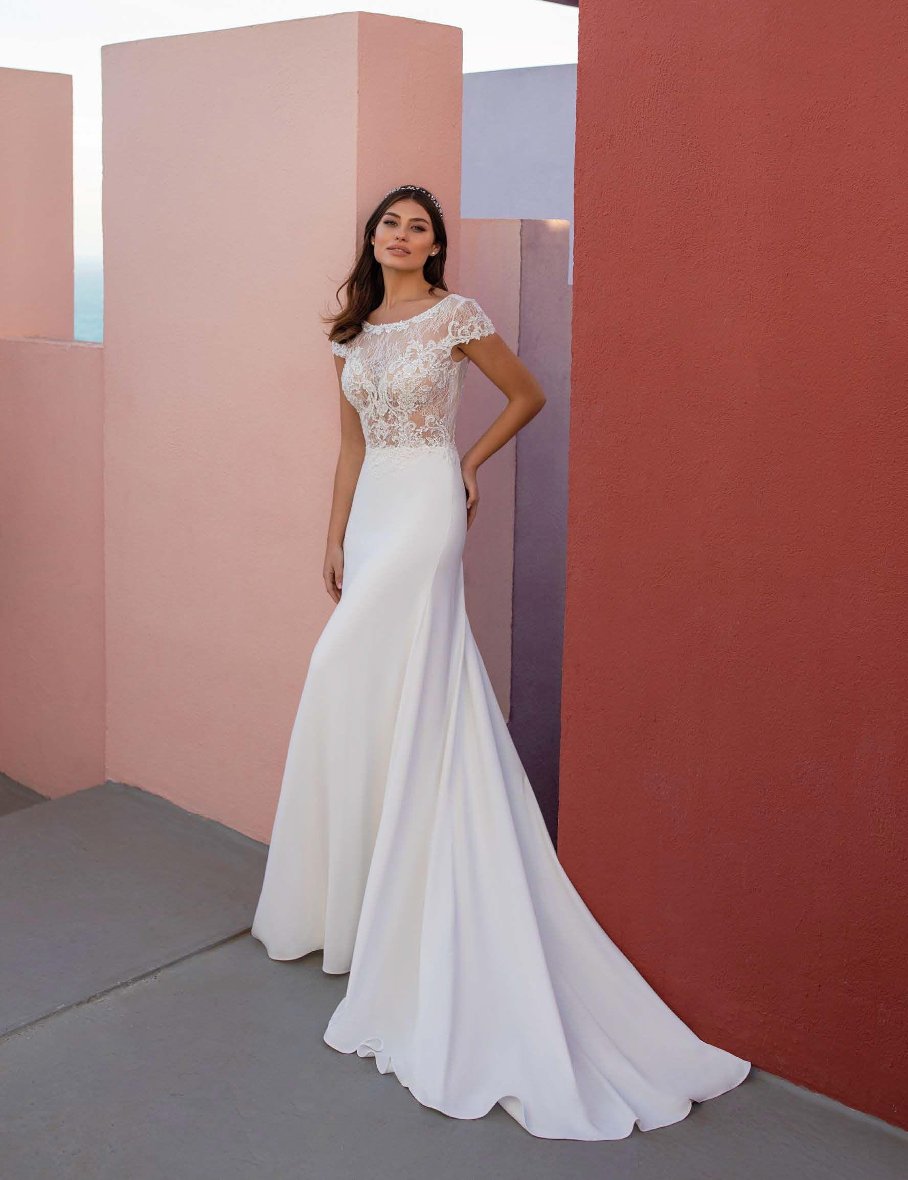 Svatební šaty OBRE působí jako dokonalá rovnováha mezi jemnou romantikou a moderní čistotou linií. Krajkový živůtek s krátkými rukávky vytváří dojem lehkosti a přirozené elegance, zatímco perličkové aplikace plynule přecházejí do hladké, splývavé sukně.