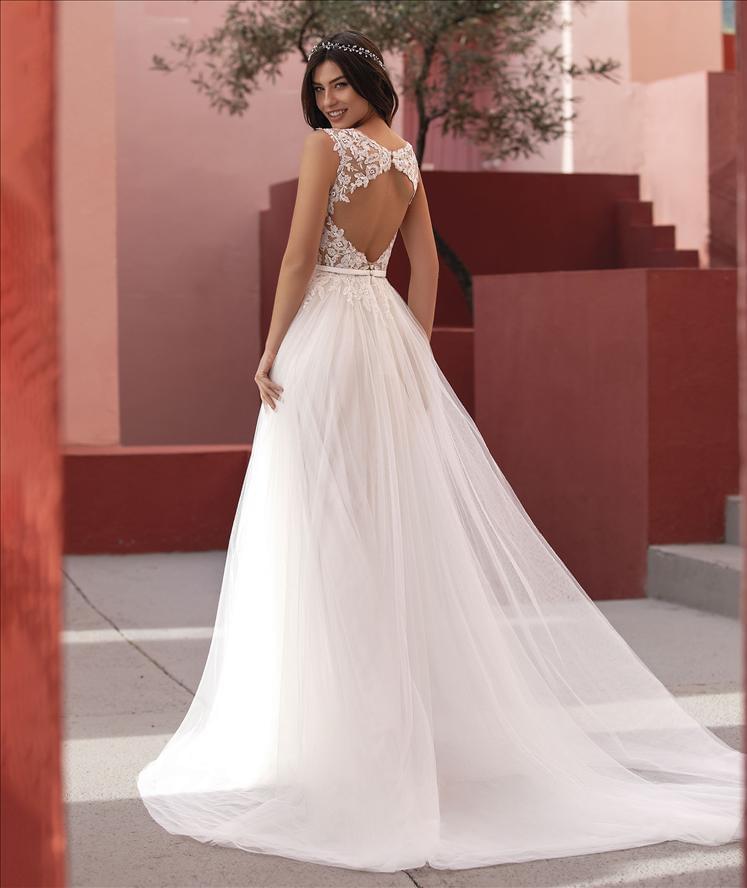 Záda zdobí hluboké vykrojení lemované krajkovými aplikacemi, které působí velmi elegantně a zároveň smyslně. Model je ideální volbou pro nevěsty, které hledají lehkost, romantiku a nadčasovou eleganci – ať už pro svatbu u moře, v zahradě nebo na zámku.