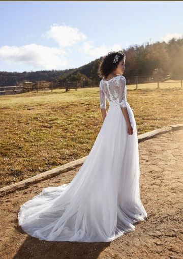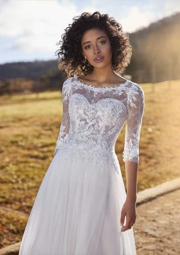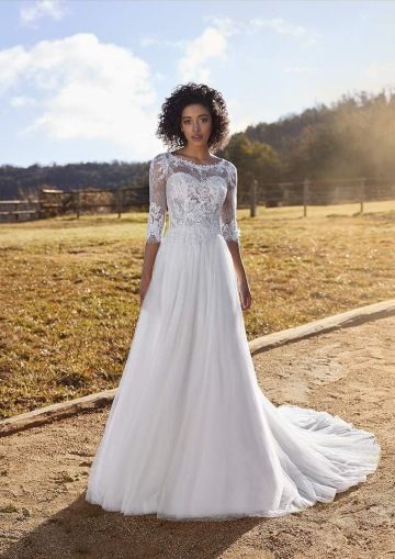 Romantické šaty PAGIBIG propojují něžnost krajky a lehkost tylu. Průsvitný živůtek s ¾ rukávem a jemnými květinovými aplikacemi decentně zakrývá, zatímco srdíčkový korzet pod ním krásně tvaruje a zvýrazňuje siluetu. Sukně z lehkého tylu se elegantně nese s každým krokem a působí snově a vzdušně. Perfektní volba pro nevěstu, která touží po nadčasové eleganci a jemné ženskosti.
