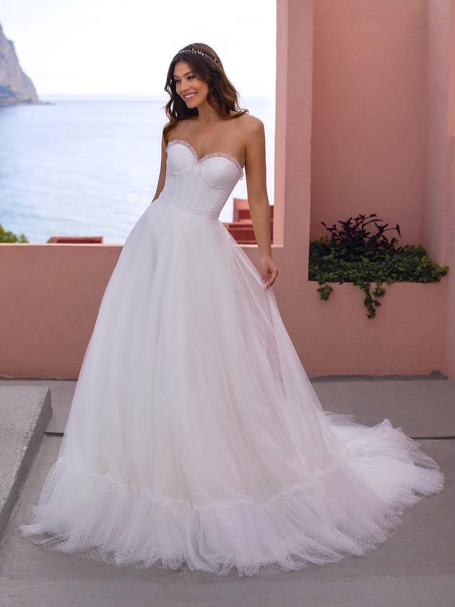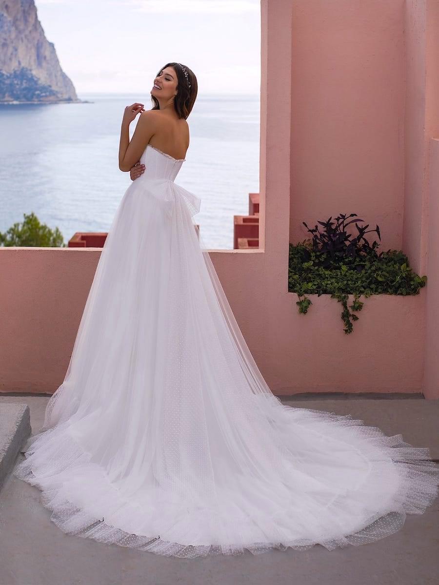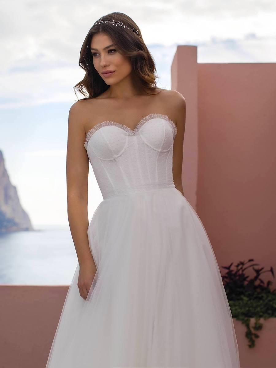 Svatební šaty PIXIE jsou ztělesněním hravé romantiky a lehkosti. Korzet bez ramínek s jemně tvarovanými košíčky a decentním zdobením krásně zvýrazňuje dekolt i pas, zatímco vzdušná tylová sukně s měkkým objemem dodává šatům pohyb a éterický dojem. Hravé a originální zdobení z jemných kanýrků puntíkového tylu. Ideální volba pro nevěsty, které chtějí působit něžně, svěže a přirozeně – s jemným nádechem pohádky.