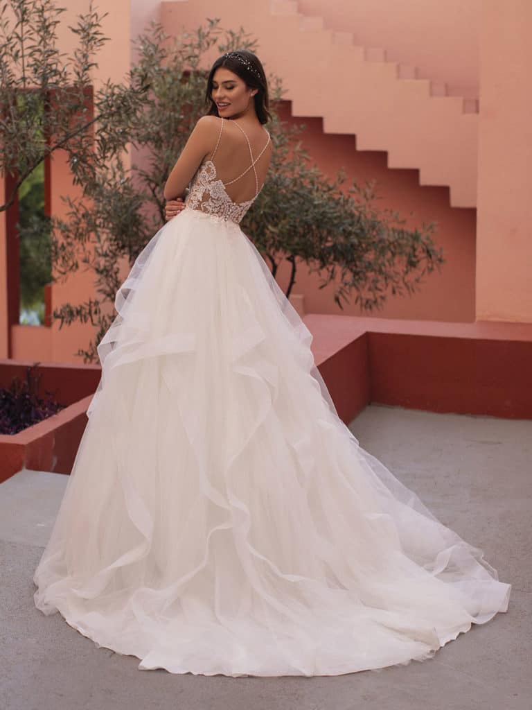 Dominantním prvkem je odnímatelná vrstva s výraznými volány, která dodává šatům dramatický objem a slavnostní charakter. Bez této vrstvy se RINA okamžitě promění v čisté, lehké šaty s hladkou tylovou sukní, ideální pro minimalističtější obřad nebo večerní část svatby.