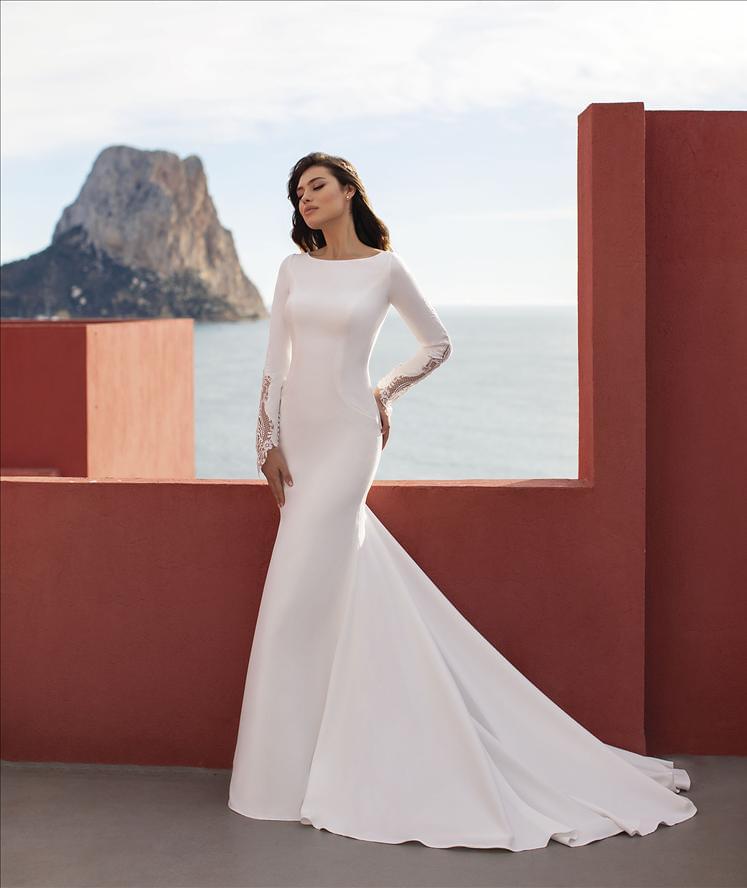 Minimalistické svatební šaty SEA zaujmou čistou linií a rafinovanými detaily. Přiléhavý střih typu fit & flare dokonale kopíruje siluetu, zatímco hladký živůtek s lodičkovým výstřihem působí nadčasově a elegantně. Dlouhé rukávy jsou ozvláštněny jemnou krajkovou aplikací, která dodává modelu lehkost. Dominantním prvkem jsou výrazně vykrojená záda s řadou potažených knoflíčků a plynule navazující vlečka.