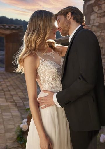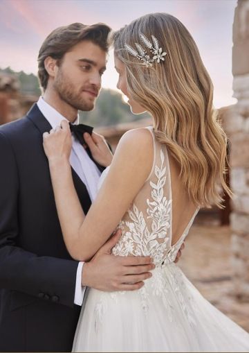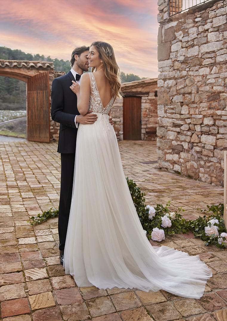 Hluboký výstřih na zádech dodává modelu smyslnost, zatímco tyl s květinovým motivem na dekoltu působí decentně a přirozeně. Tyto šaty jsou jako stvořené pro nevěstu, která chce působit něžně a přitom nezapomenutelně.
